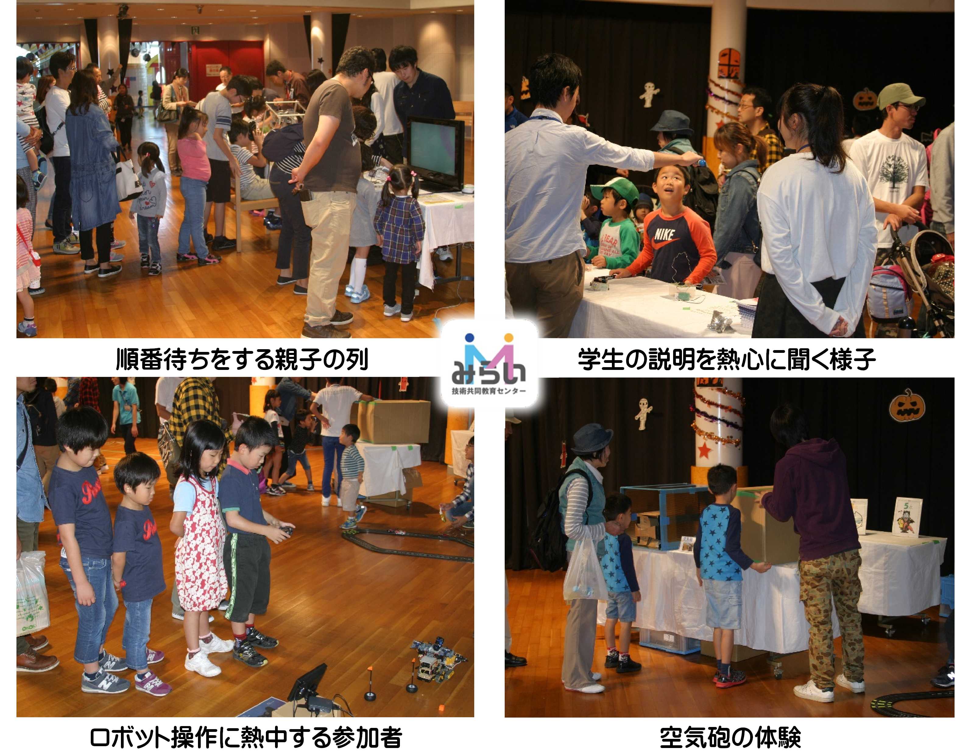 たくさんの親子が科学おもちゃを体験し,楽しんでくれました。今回の科学おもちゃ体験ではミニロボット操作,手回し発電,空気砲,ホバークラフト,電流イライラ棒,ヘッドマウントディスプレイによるバーチャルリアリティーなど一緒に体験しながら紹介をしました。