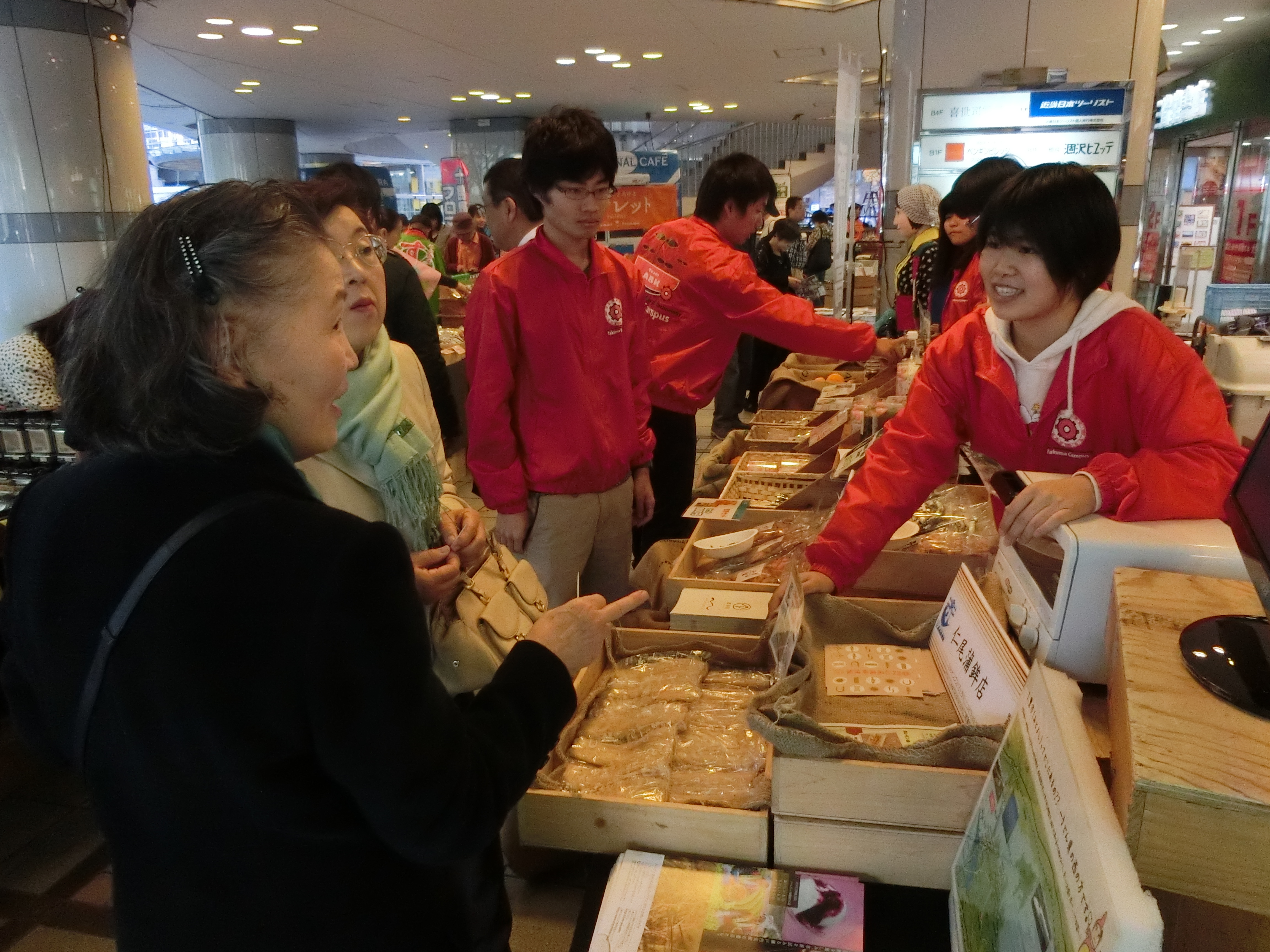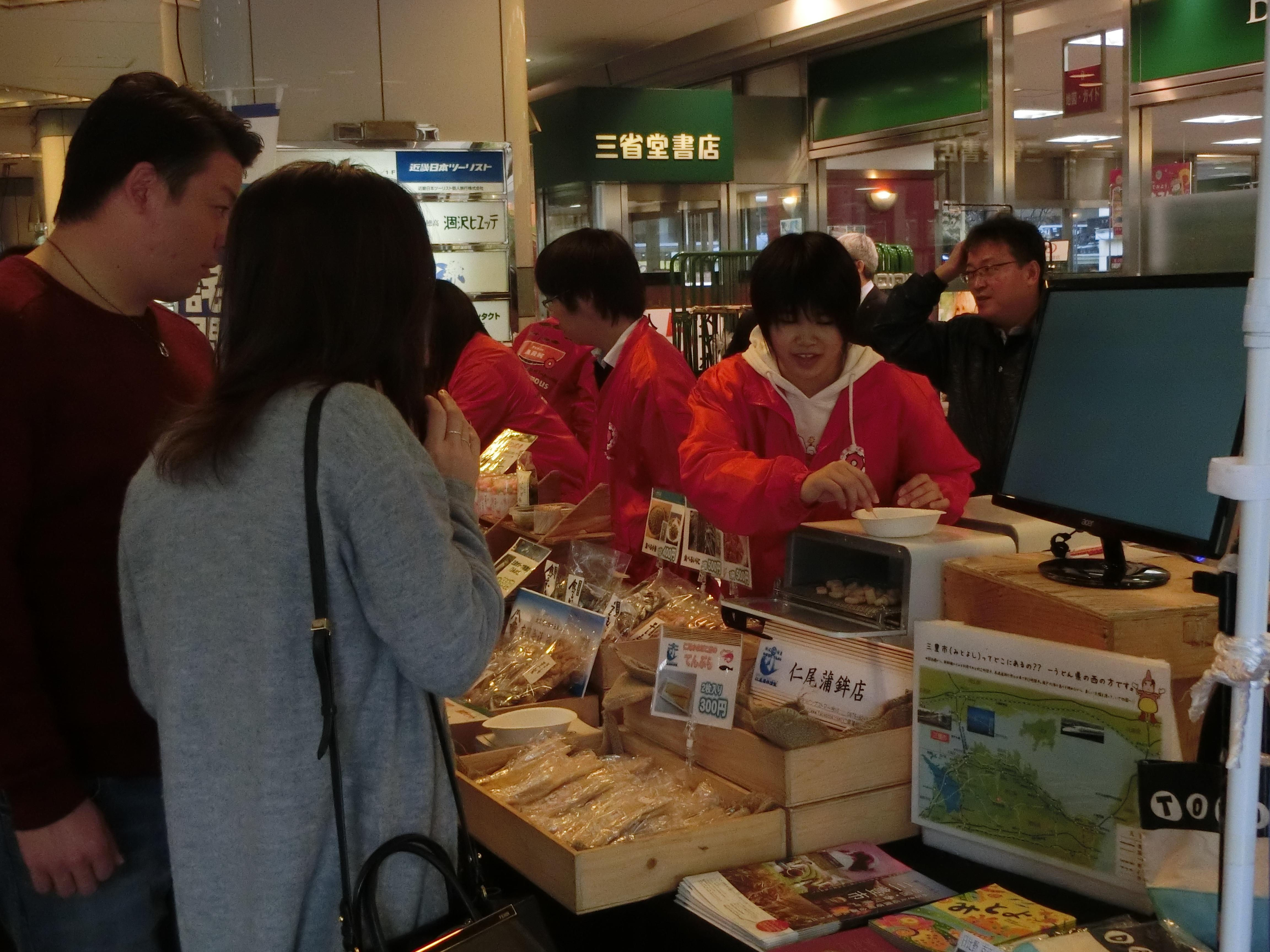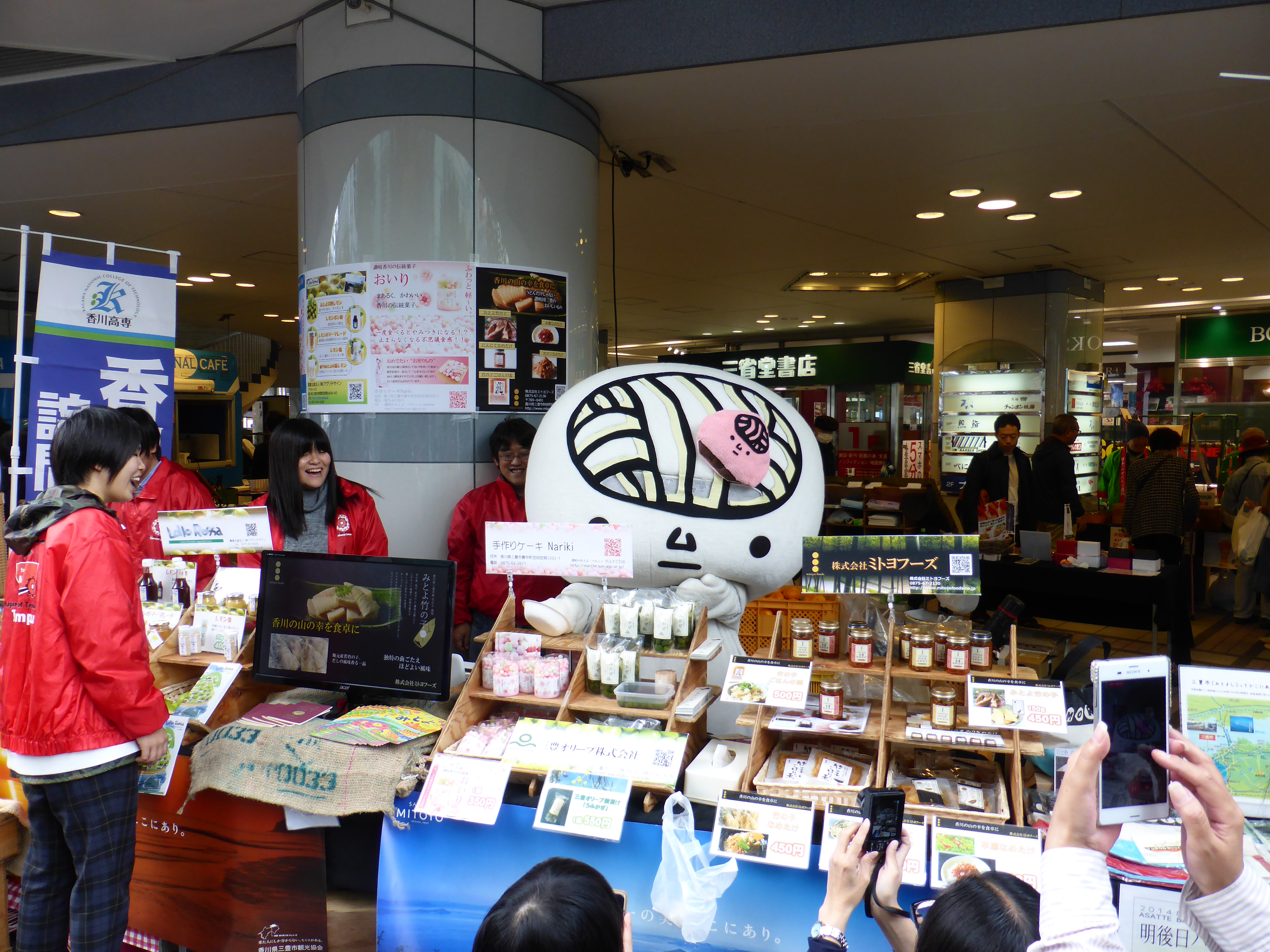 出店ブースでは、三豊市の特産品紹介及び販売と観光案内を行いました。出店には本校の学生5名が参加し、特産品PRのためのポスターやチラシ、ディスプレイなどを工夫して作成し、当日は、試食用に簡単な調理販売を行うなど、自分たちのアイディアで三豊市の特産品を少しでも知ってもらおうと試みました。