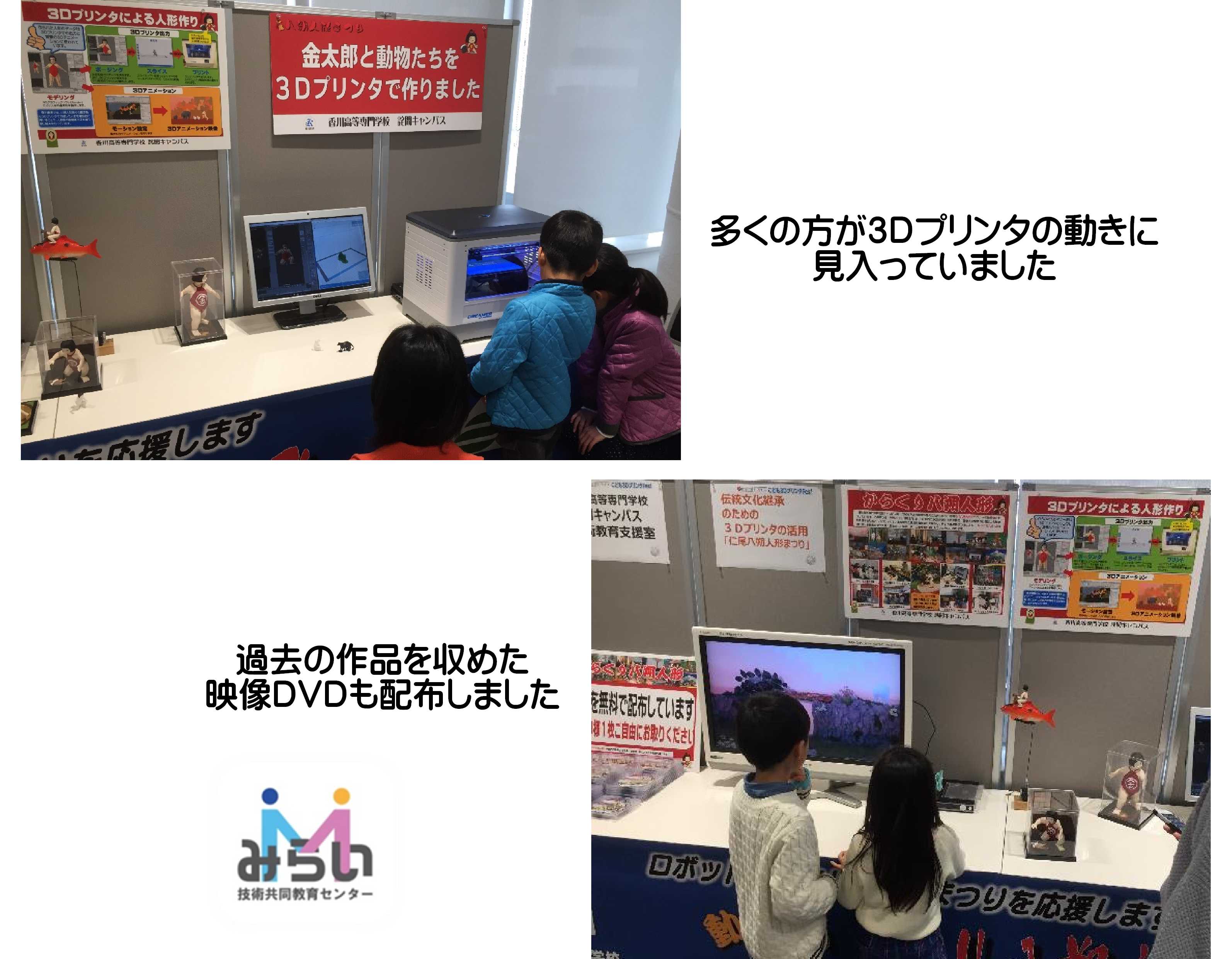 期間中は、3Dプリンタによる製作デモを行ない、来場者には仁尾八朔人形まつりの作品集DVDの配布を行ないました。多くの方々からご好評をいただきました。