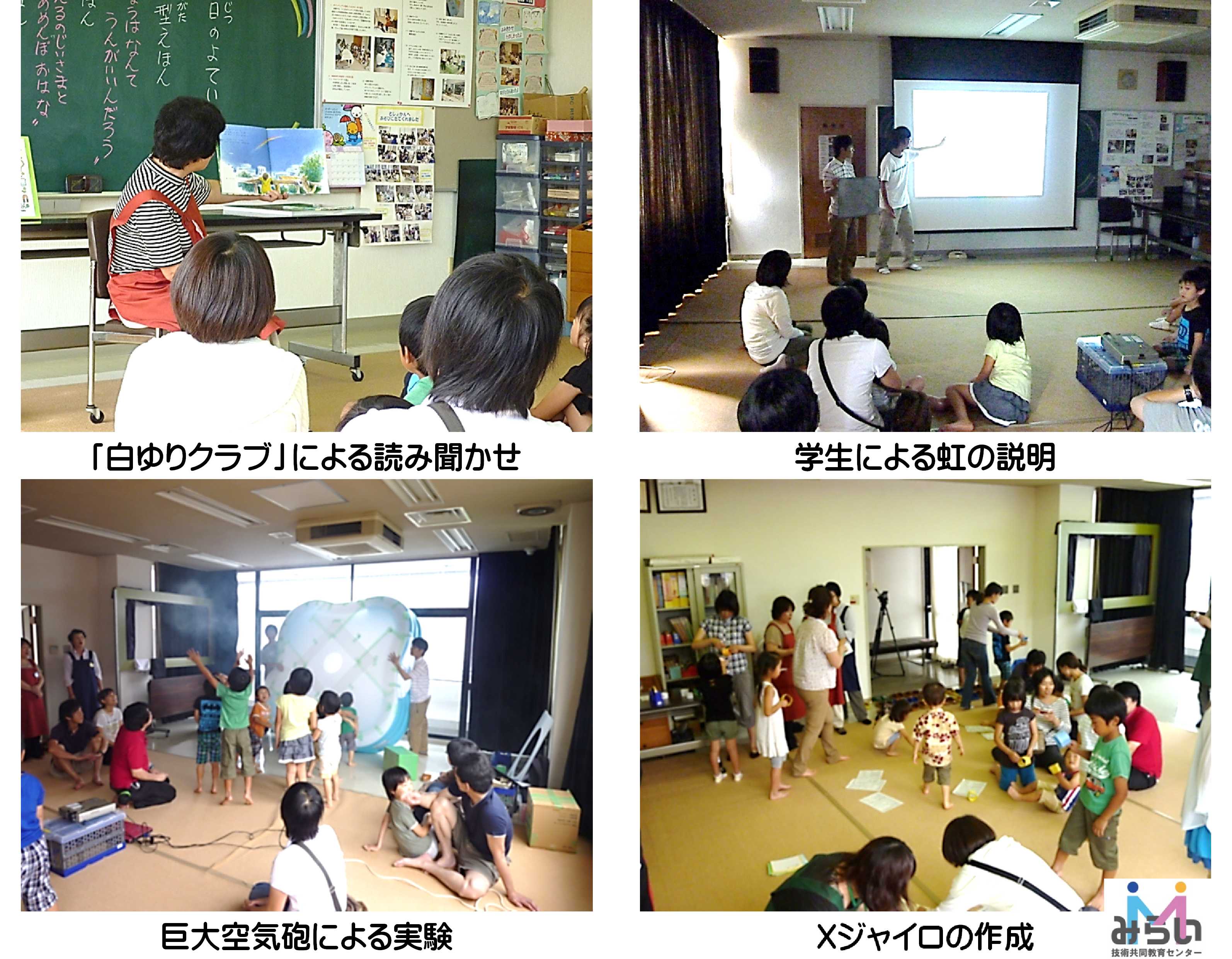 この日は、絵本の読み聞かせの後、絵本の内容とリンクした「虹」の実験をはじめ、「巨大空気砲」「Xジャイロ」の実験や工作を学生達が子供達にわかりやすく説明・指導しました。室内でできる虹や空気砲の輪に子供たちは大喜びでした。