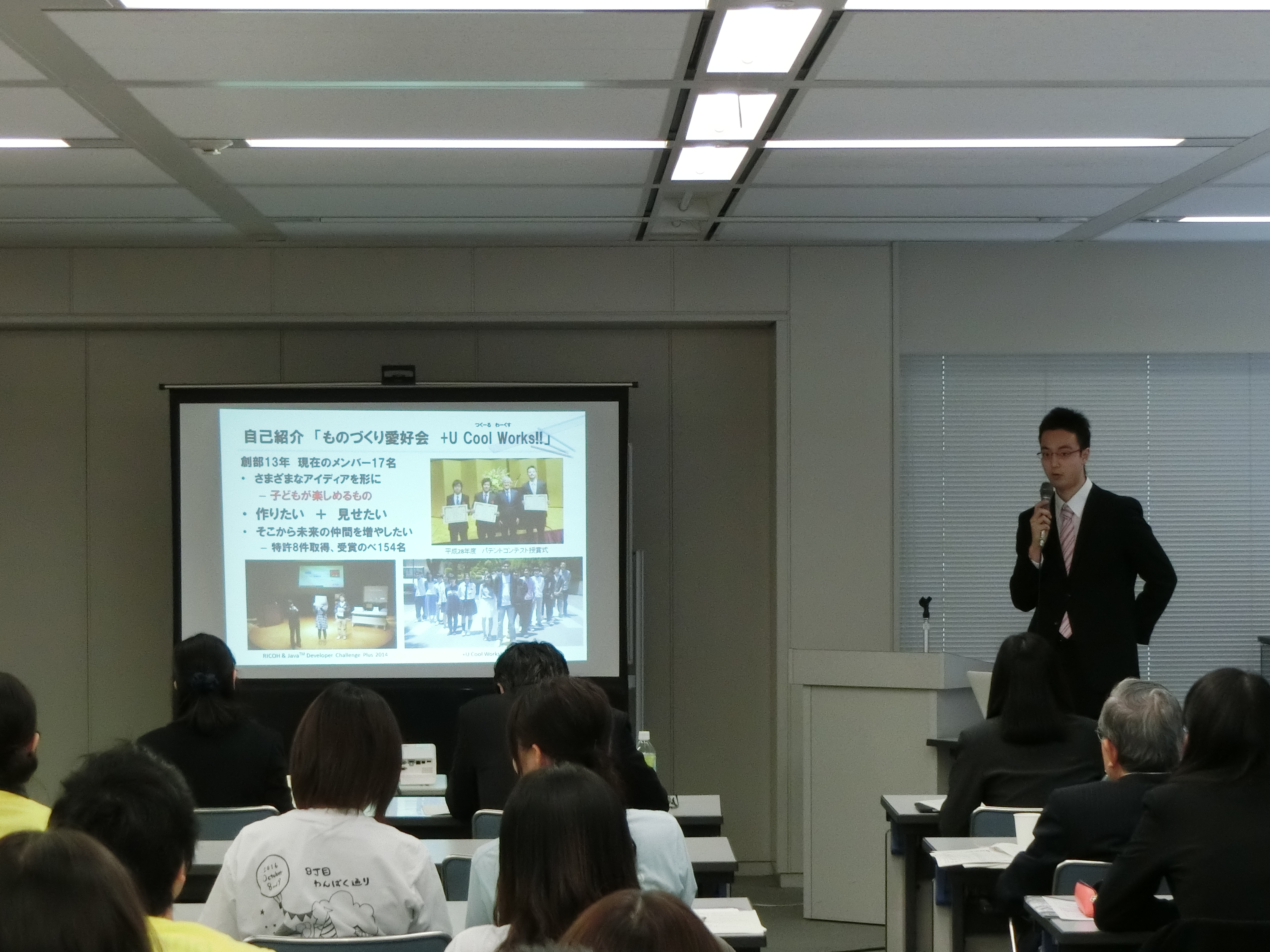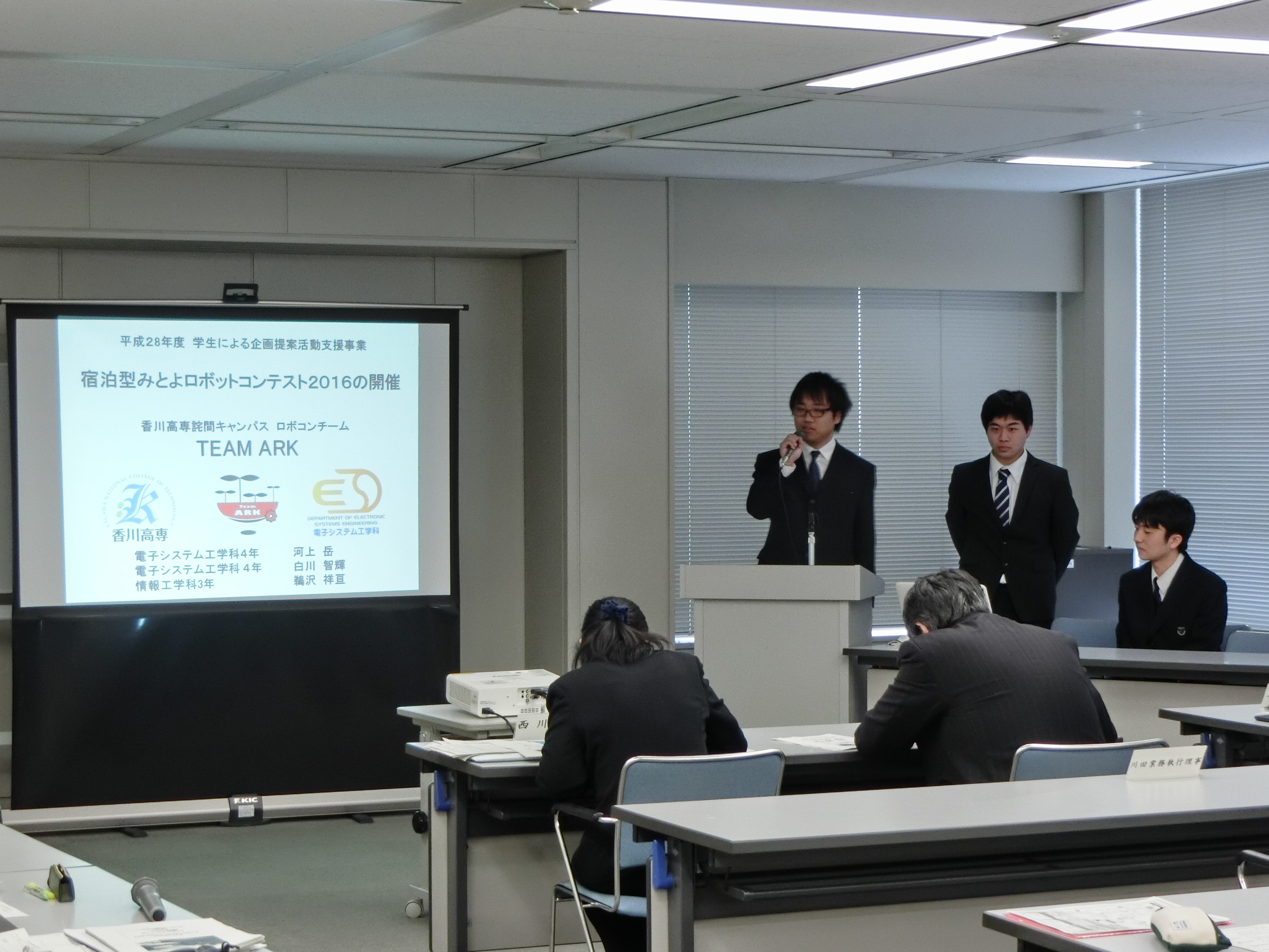 報告会には香川県内の大学生・高専生・高校生による9団体が参加し、本校からは「チーム・ドリームランド」「TEAM ARK」「ものづくり愛好会」の代表者が平成28年度の活動成果を発表しました。