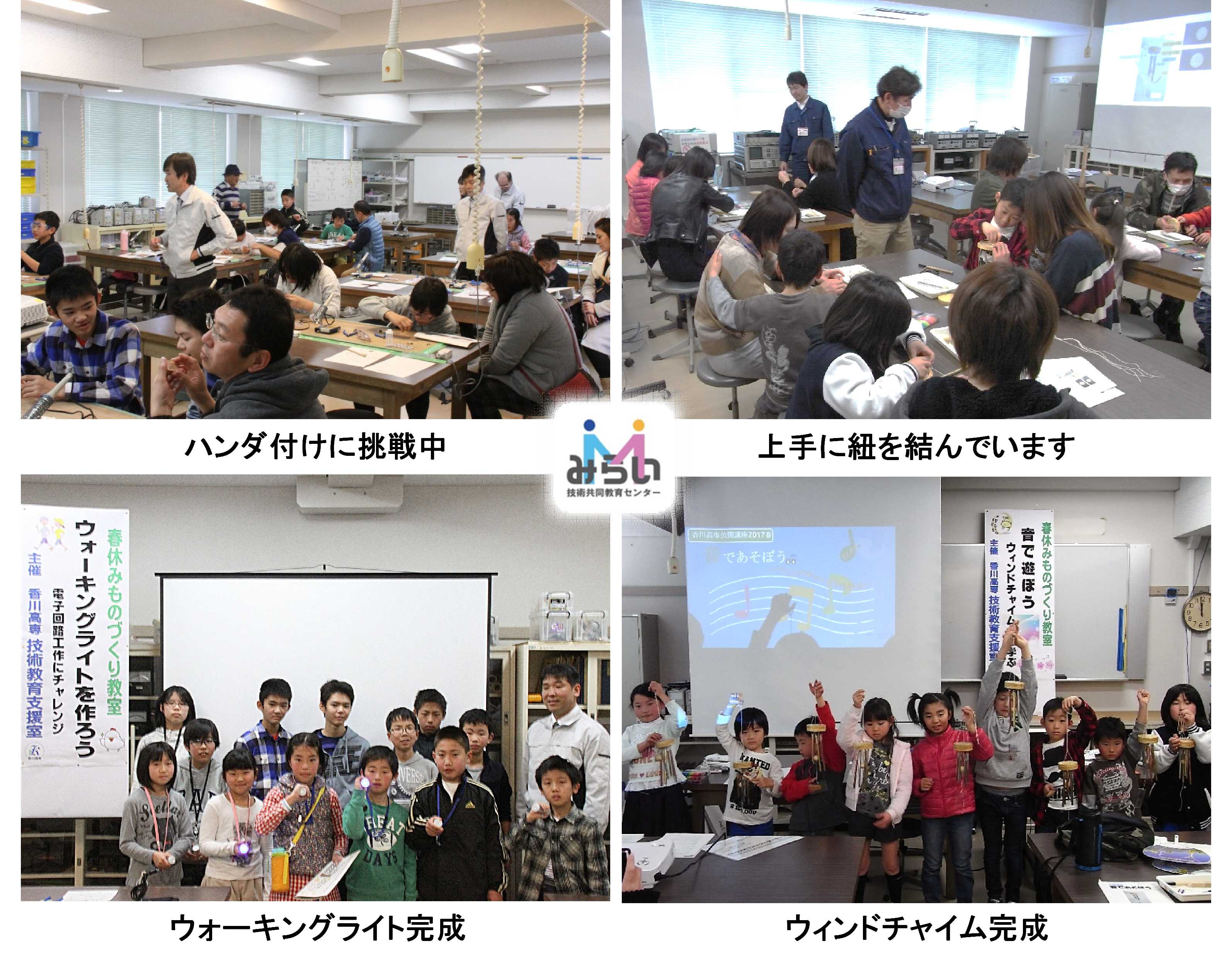 この教室は、香川高専両キャンパスの技術教育支援室が合同で毎年開催している工作教室で、今年は詫間キャンパスが会場でした。今回は「ウォーキングライトを作ろう」と「音であそぼう」の2テーマでした。