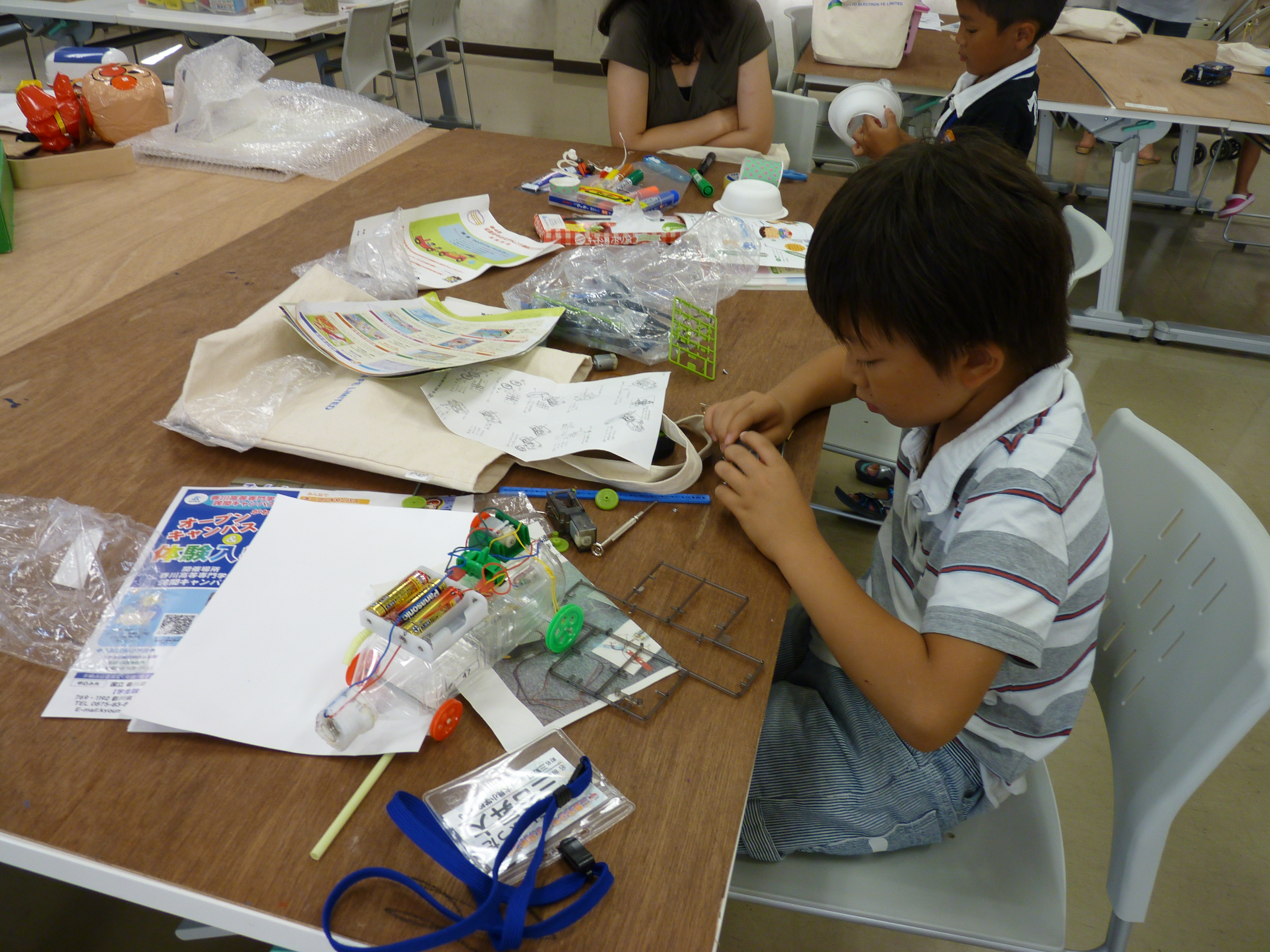 夏休みに入りましたが、この日もたくさんの子ども達が元気いっぱいに参加し、「発明くふう展」に出品する作品や、アイディア工作を作りました。また、チャレコン参加者は予選会まで1ヶ月となり、これから夏休みの時間を有効に使って作品づくりに励みます。製作現場には緊張感があり、どのチームも全国大会目指して真剣に取り組んでいます。