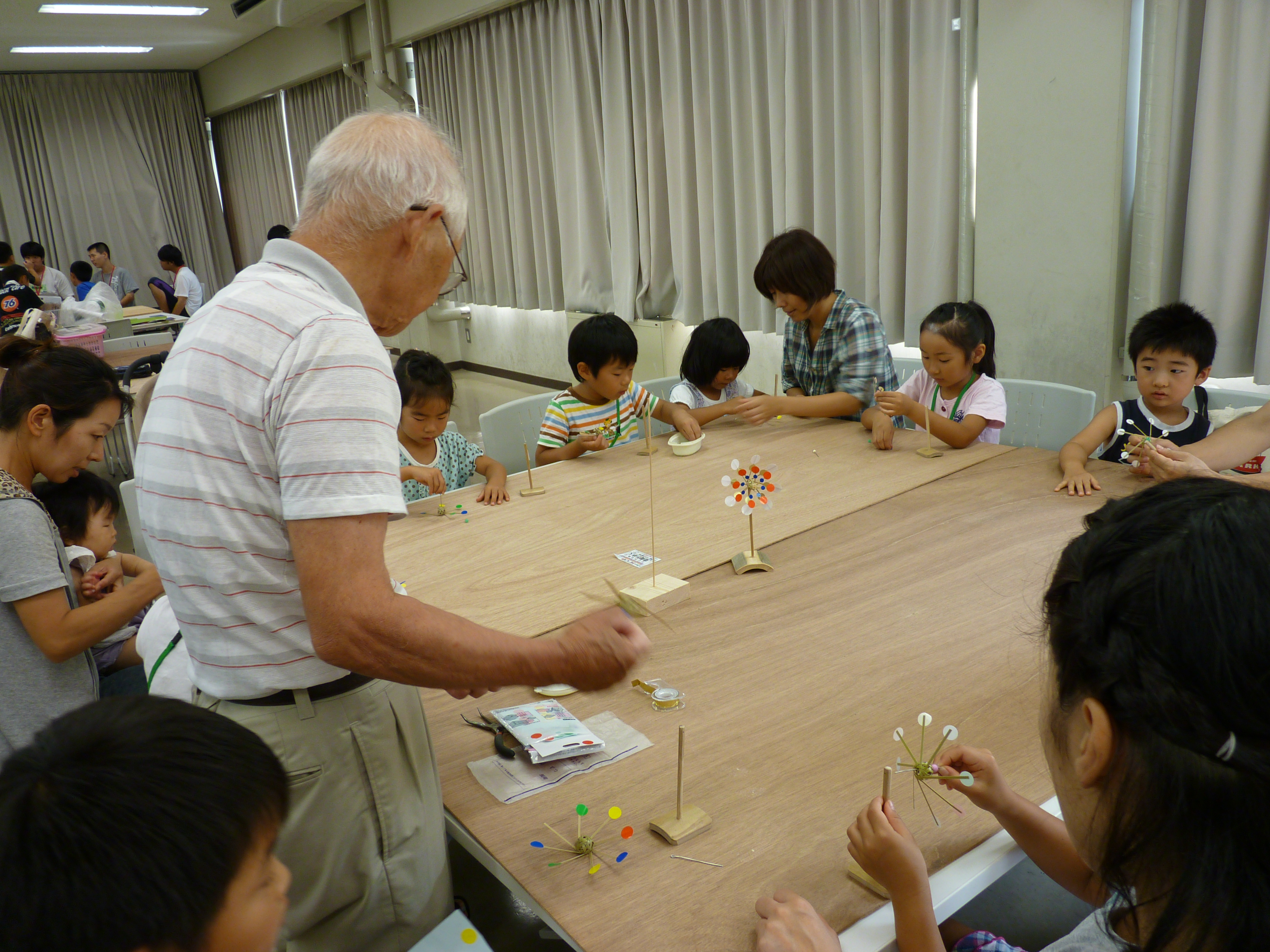 アイディア工作では「まんのう町竹細工同好会」から小山会長、浦川さんを講師としてお招きし、竹で作る風車、シュロを編んで作るバッタに挑戦しました。草バッタは細かい作業と破れやすい葉に苦戦しましたが、根気強く丁寧に作りました。竹の風車は好きな色のシールを貼り、楽しみながら作る事ができました。子ども達は自然の材料で工作する事や、植物の感触を存分に楽しむ事ができました。