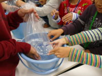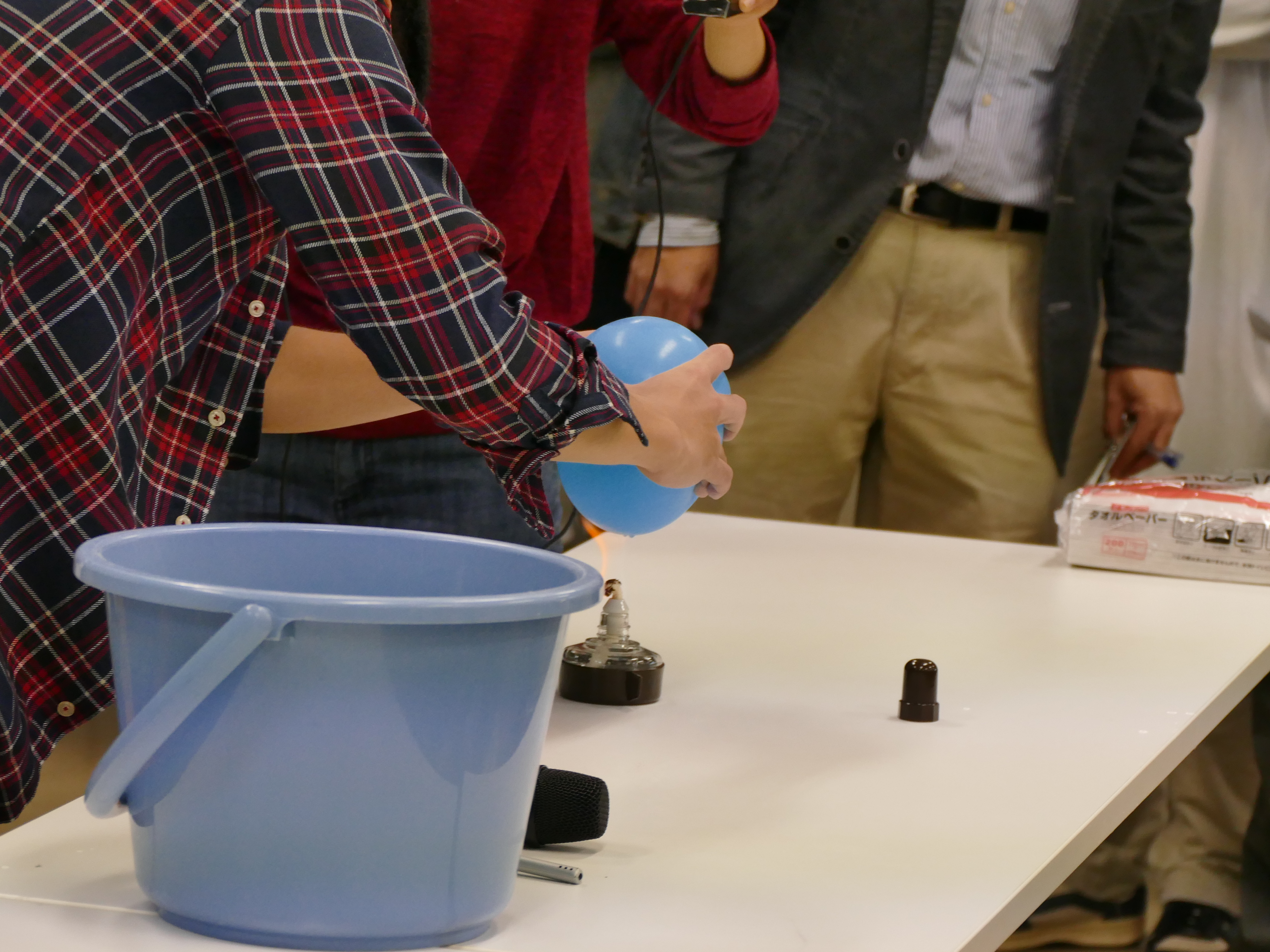 水を入れたポリ袋にペンを差して、水が漏れるかどうかを試しました。また、水をたっぷり入れた風船を火であぶっても割れないという実験をしました。