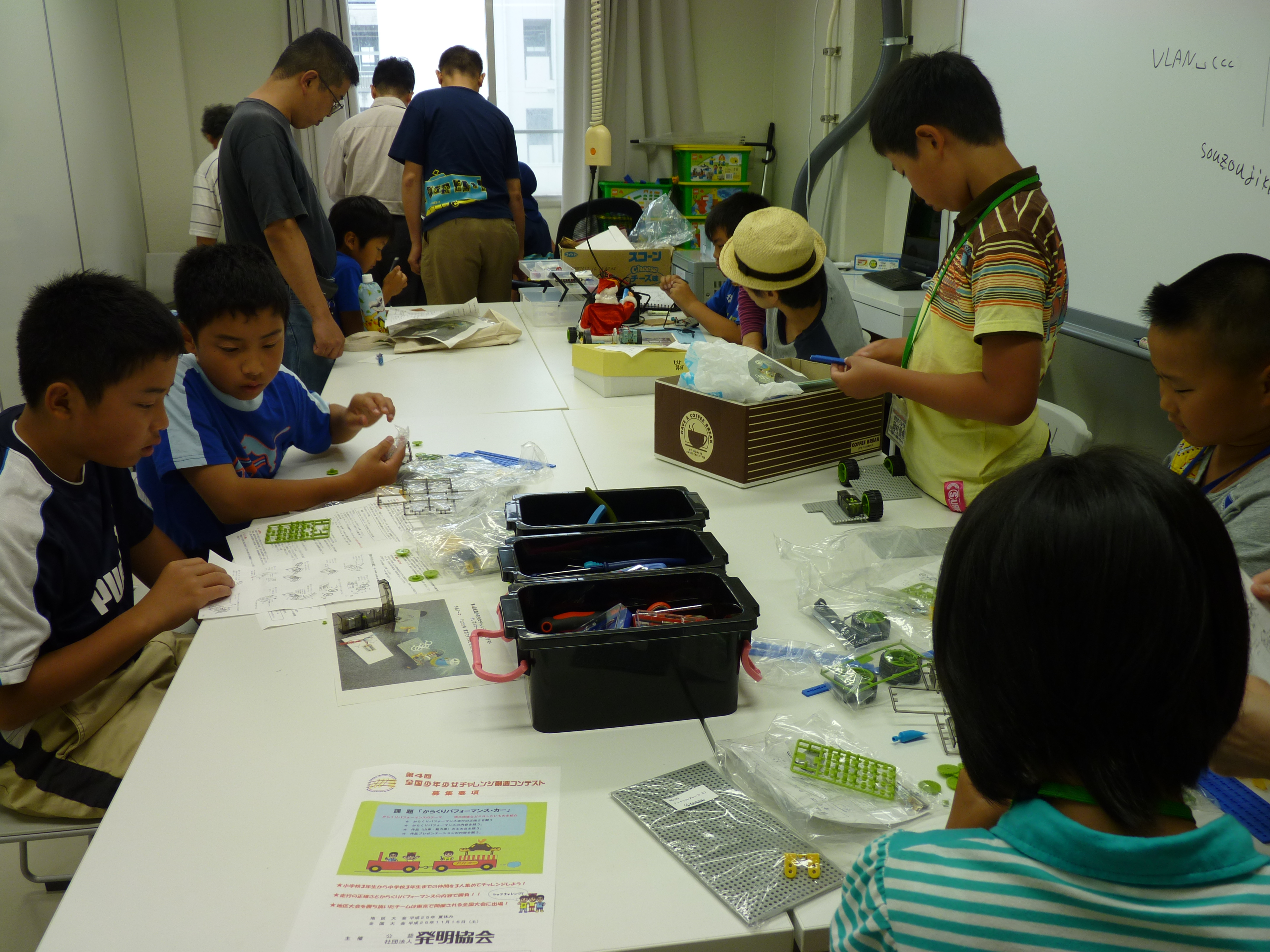 前回の活動で発明クラブ指導員からルール説明を受けたチャレコン参加者は、8月の地区予選会に向けて作品づくりに取り掛かりました。今回のテーマ「からくりパフォーマンス・カー」はパフォーマンスカーと、それをけん引する動力カーの2台の車を製作します。何をPRしようか、どのような仕組みの車を作ろうか、とチーム内で相談しながらキットの組み立てを行いました。