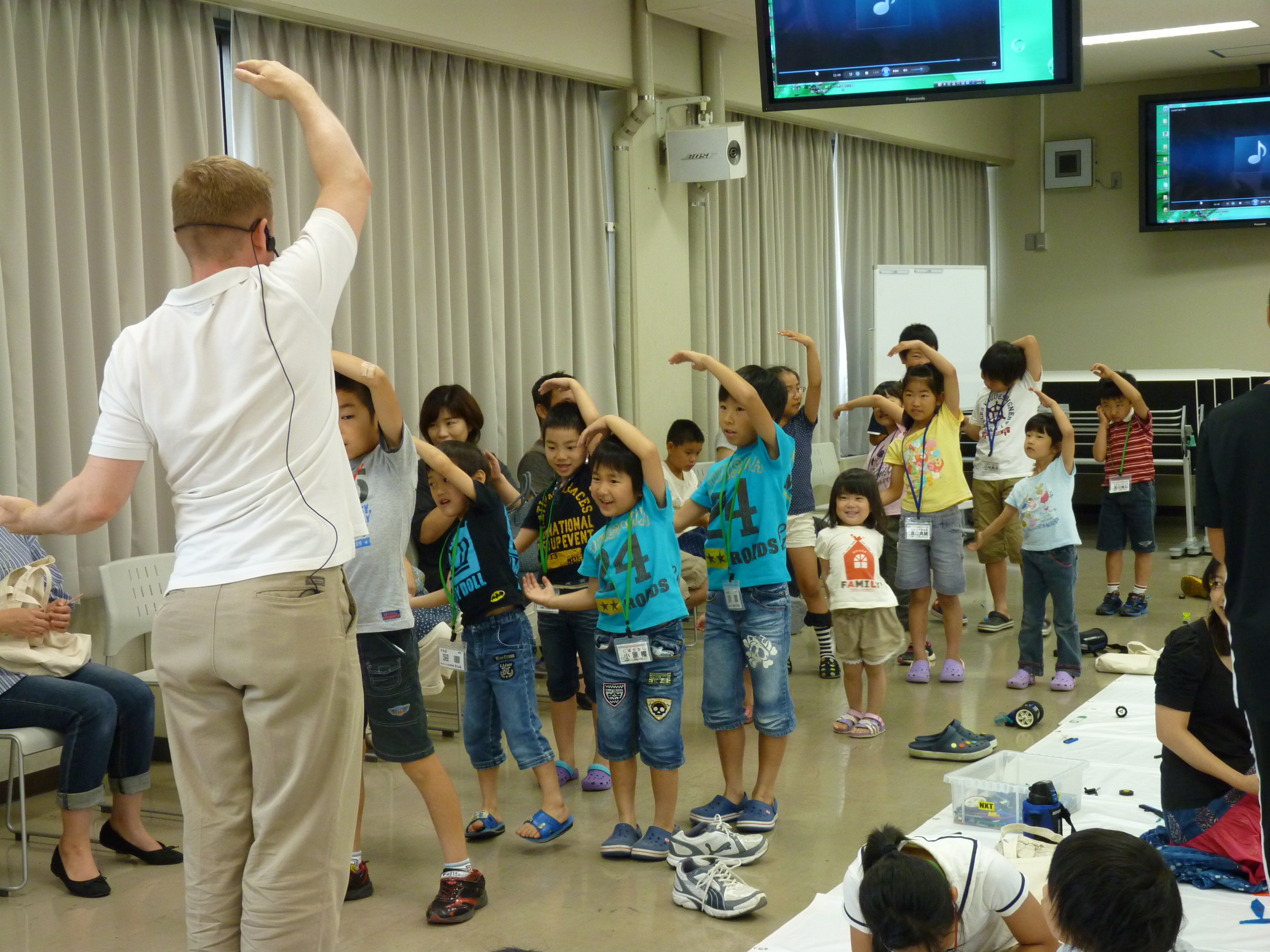 活動の休憩時間に行っているロバート先生の英語教室は、回を増す毎に大きな声で、楽しそうにコミュニケーションできています。今後も、気軽な雰囲気で自然に身につく英会話を活動の中に取り入れて行こうと考えています。