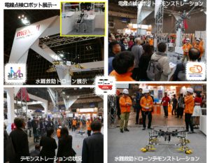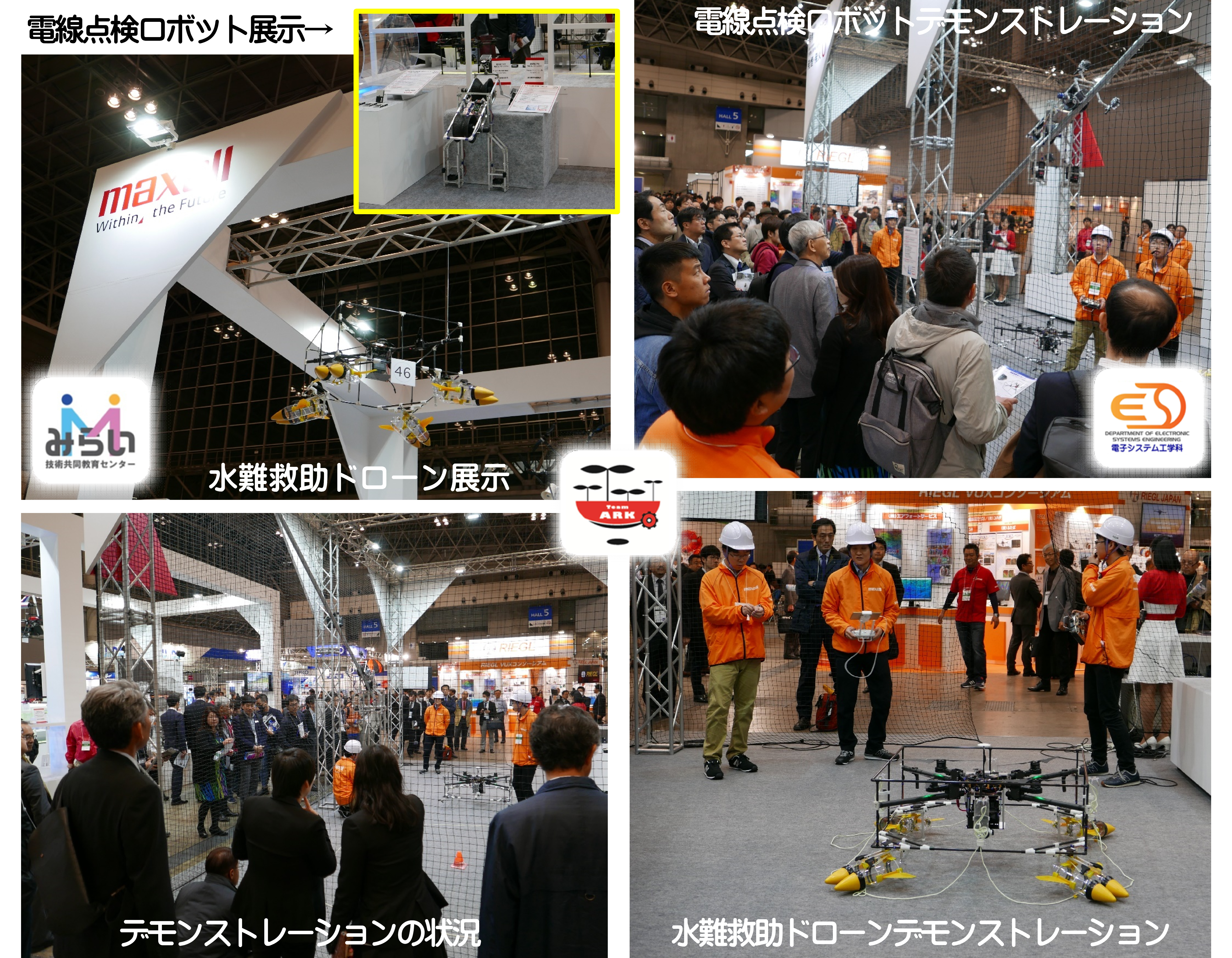 3月22日(木)~24日(土)幕張メッセで行われたジャパン・ドローン2018 マクセルブースにおいて電子システム工学科三﨑・岩本研究室で開発され平成30年1月31日に内閣府オープンイノベーションチャレンジ2017に認定された「水難救助ドローン(㈱空撮技研と共同開発)」、「電線点検ロボット(テクノサクセス㈱・四国電力㈱と共同研究)」の展示・デモンストレーションを行いました。