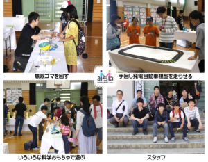 当日は晴天に恵まれ、たくさんの子ども達が参加してくれました。集まった子ども達は、保護者と一緒に展示されている科学おもちゃの無限ゴマや手回し発電自動車模型などで楽しんでいました。