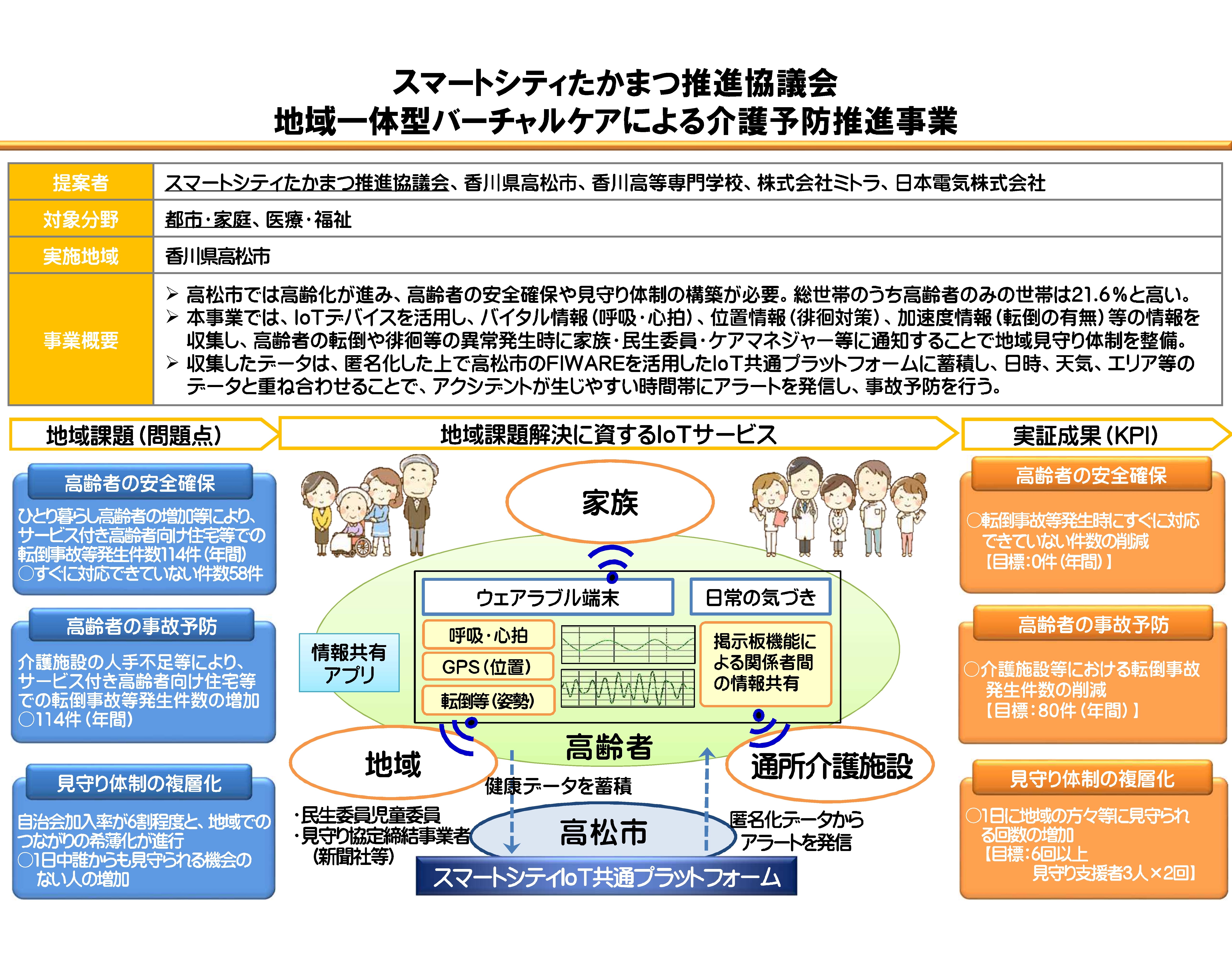 そのプロジェクトのさらなる推進を目指し、総務省「IoTサービス創出支援事業(平成30年度予算)」にテーマ名「地域一体型バーチャルケアによる介護予防推進事業」を応募していましたが、6月15日に採択が決定し公開されました。