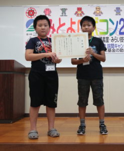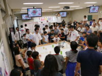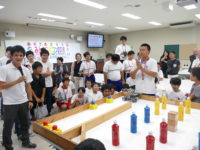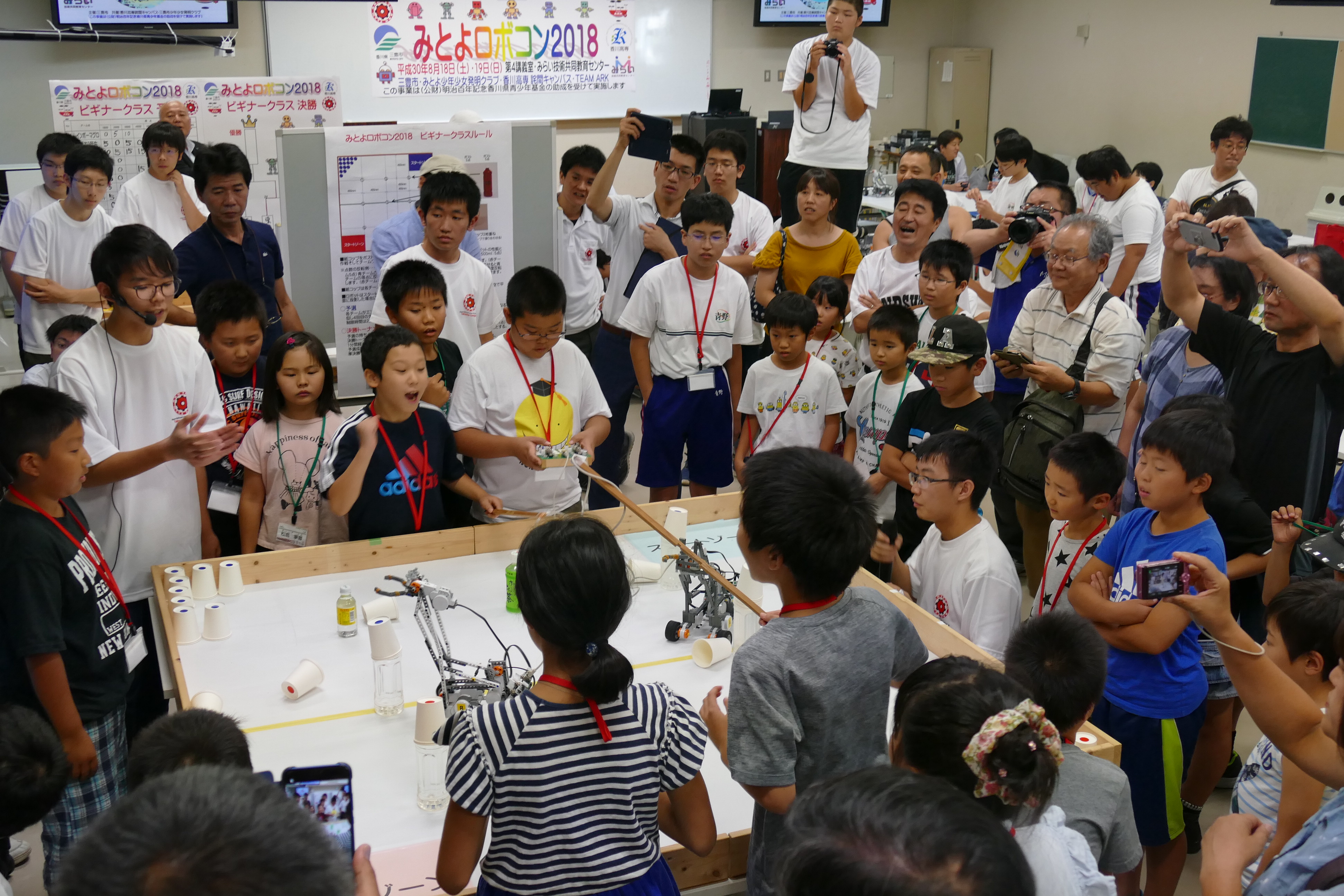 ビギナークラス(小・14チーム)は、リモコン操縦型で、立てたペットボトルに紙コップをかぶせて得点を競います。操作力に加え判断力も必要となる中、小学生とは思えない白熱した攻防戦が繰り広げられていました。今年は参加チーム数が多く、予選は大混戦となり会場は大盛り上がりでした。