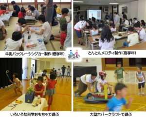 平成30年8月17日(金),小豆島町立池田公民館において,詫間キャンパス「チーム・ドリームランド」の学生が出前ものづくり講座を行いました。小学校低学年向けの紙工作「牛乳パックレーシングカーを作ろう!」には22名、小学校高学年向け電子工作「とんとんメロディを作ろう!」には20名が参加してくれました。
