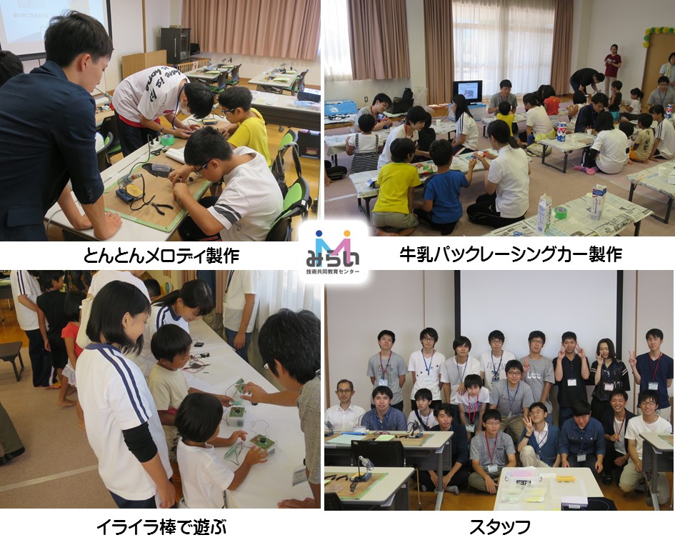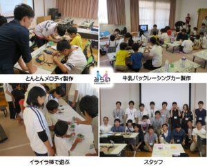 平成30年8月27日(月),丸亀市東小川児童センターにおいて,詫間キャンパス「チーム・ドリームランド」の学生による出前ものづくり講座を行い、低学年向け紙工作「牛乳パックレーシングカーを作ろう!」(参加者21名) ,小学校高学年向け電子工作「とんとんメロディを作ろう!」 (参加者4名)を実施しました。作品が完成すると,子供たちはそれぞれ自分でつくった作品を手に,何度も楽しそうに動かして遊んでいました。