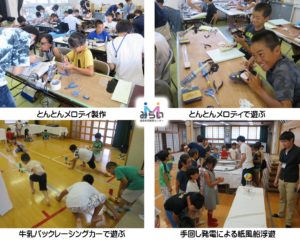 ものづくり教室終了後は「手回し発電紙風船浮遊」など「理科学教材展示」を実際に体験しました。子供たちは楽しく遊びながら色々な「科学のふしぎ」を体感しました。