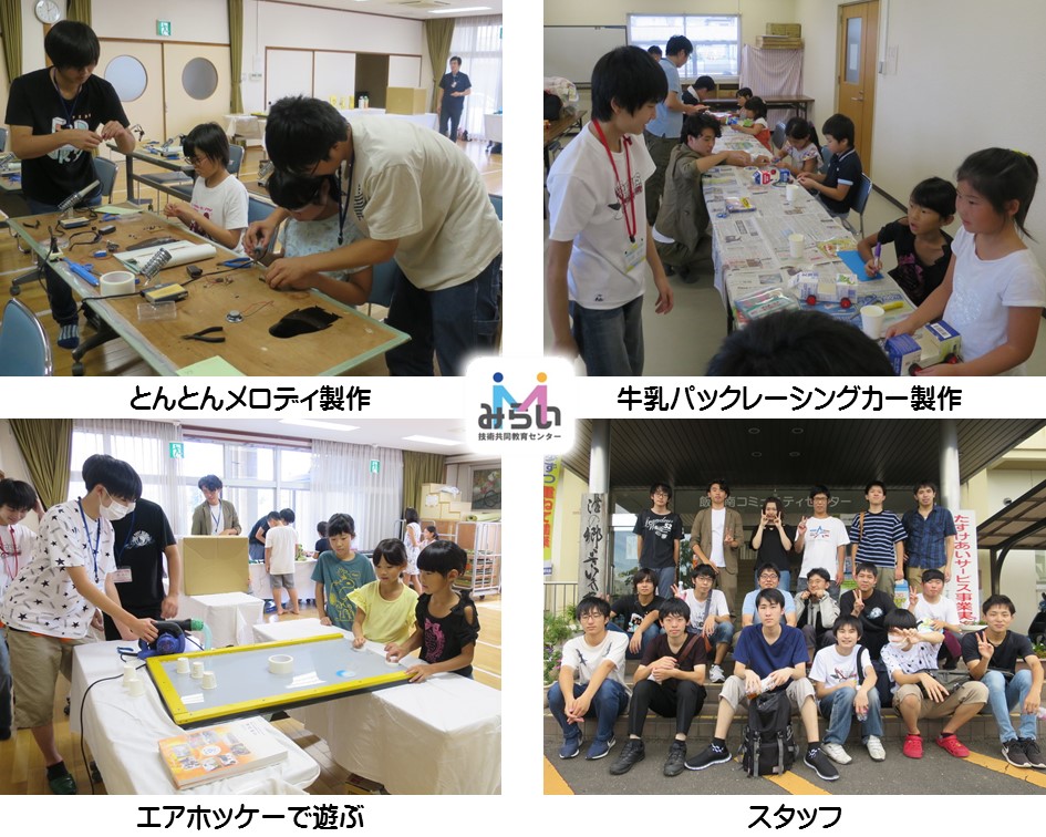ものづくり教室では,低学年向け紙工作「牛乳パックレーシングカーを作ろう!」を,小学校高学年向け電子工作「とんとんメロディを作ろう!」を実施しました。