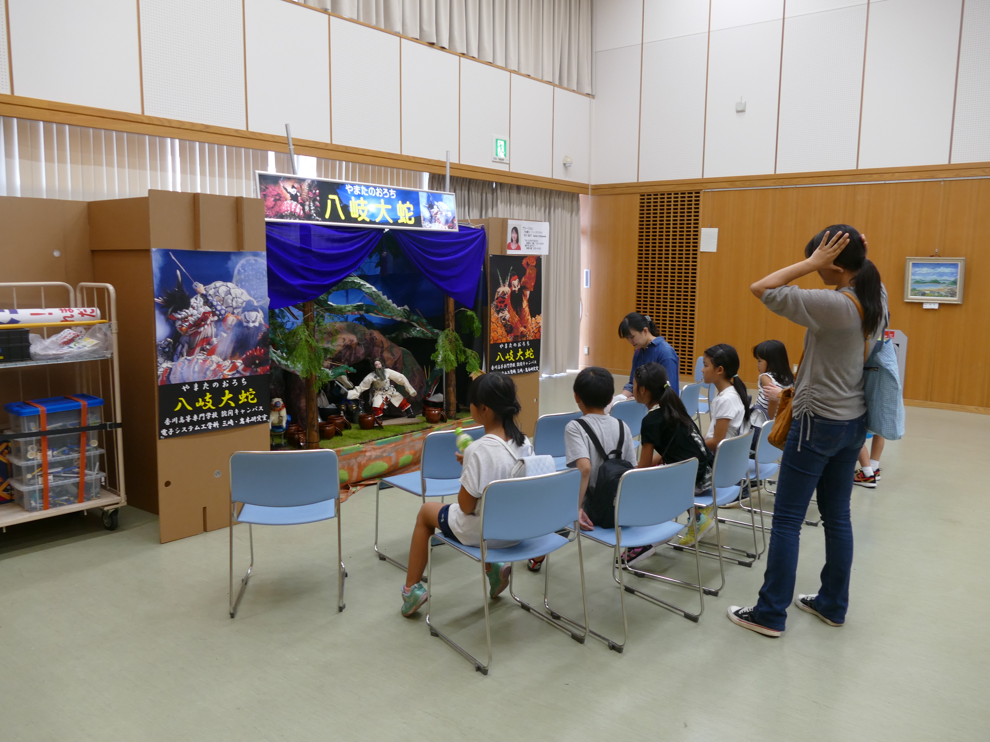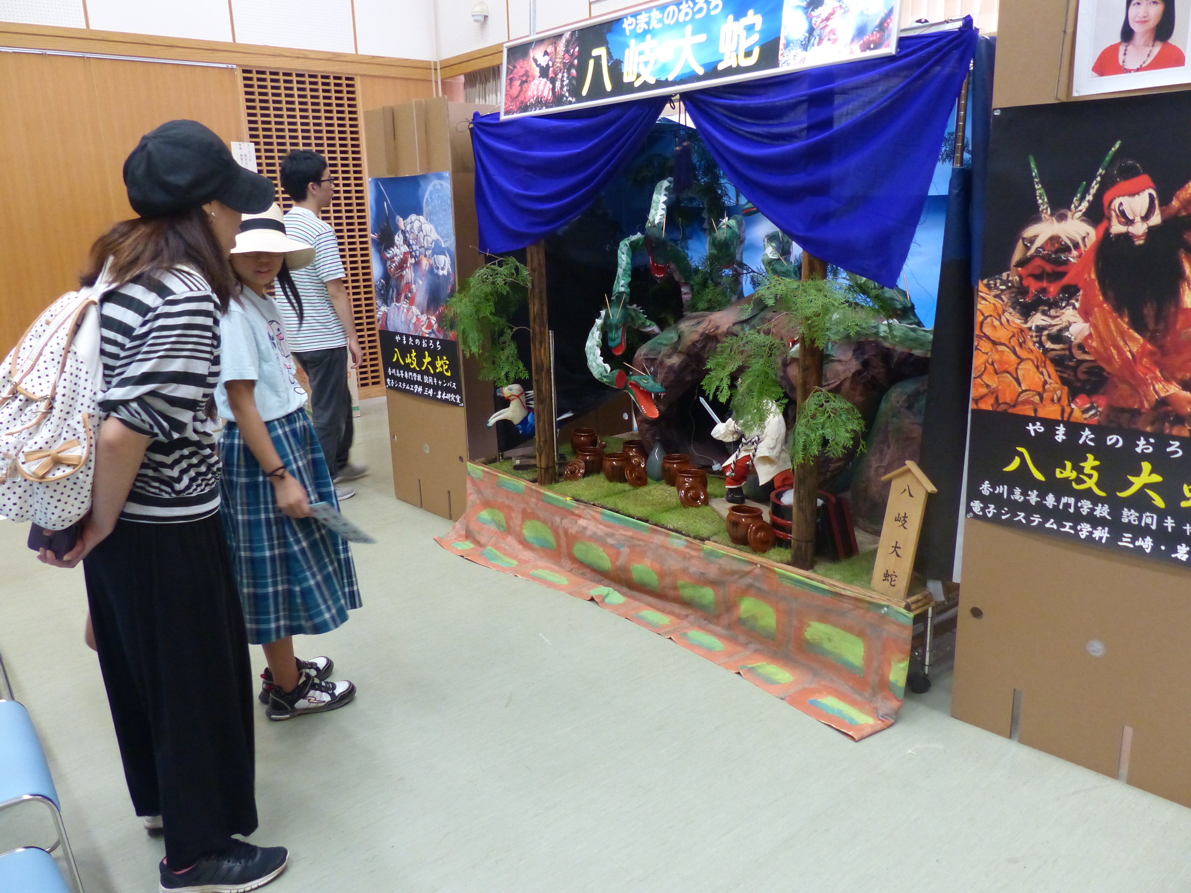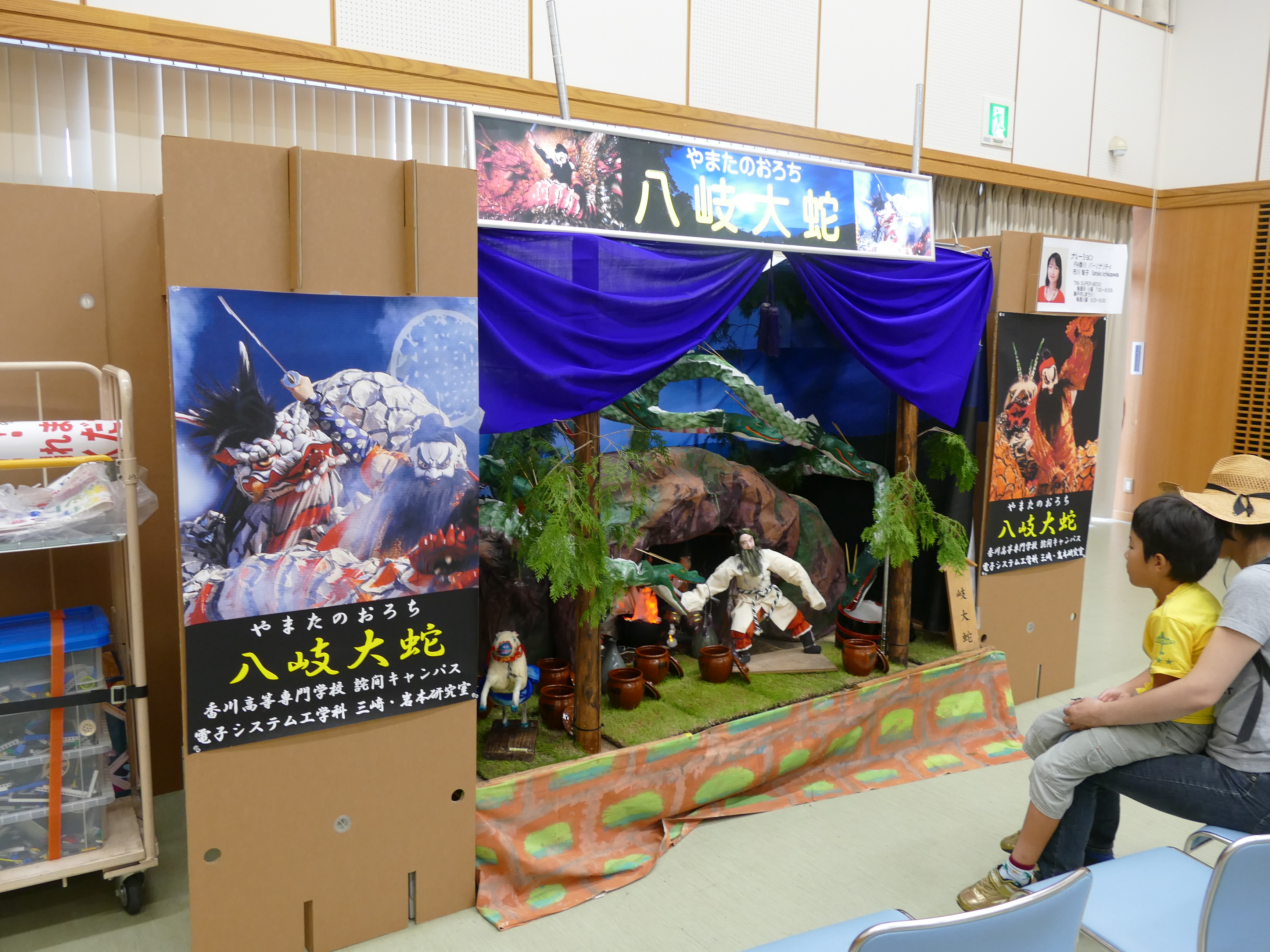 動く八朔人形の展示として詫間キャンパス電子システム工学科の三﨑・岩本研究室の学生が中心となり「TEAM ARK」の学生の協力を得てオリジナルの音声で「八岐大蛇(やまたのおろち)」の展示を仁尾町文化会館内で行いました。