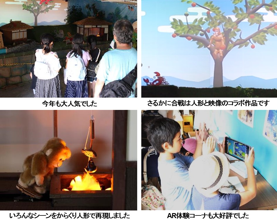 さるかに合戦は2度目の展示となりますが、小さいお子さんから大人の方まで楽しめるように色々な部分を大きく変更しました。「もう1回見たい!」といいながら、何度も何度も繰り返して見てくれたお子さんもたくさんいらっしゃいました。