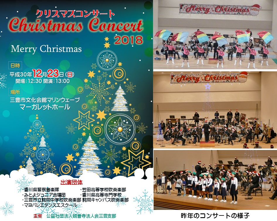 2018年12月23日(日)13時より、三豊市文化会館マリンウェーブにおいて、(公社)観音寺法人会三豊支部主催の「クリスマスコンサート2018」が開催されます。今年も詫間キャンパスの吹奏楽部、野球部、TEAM ARKの学生が参加します。