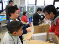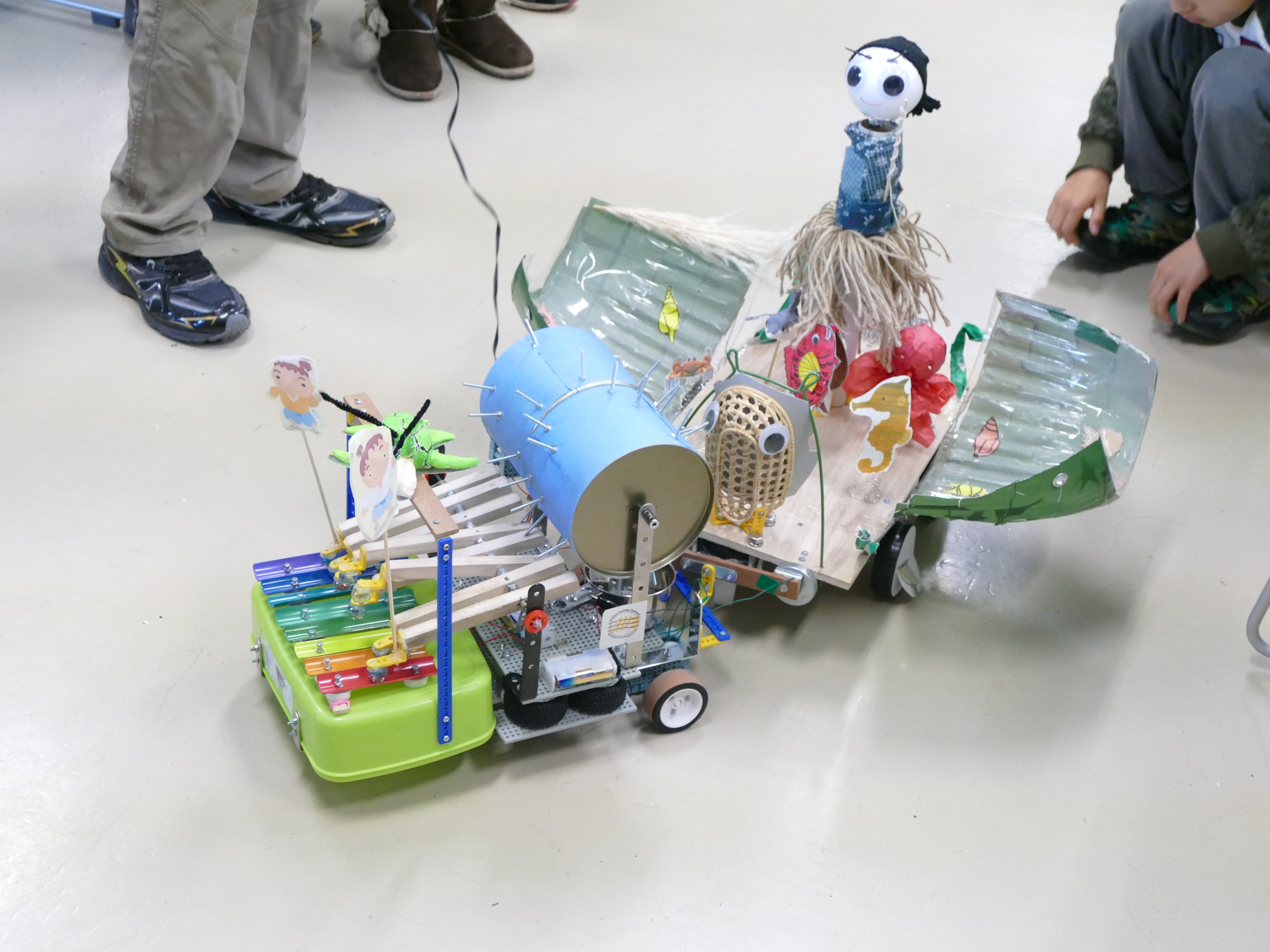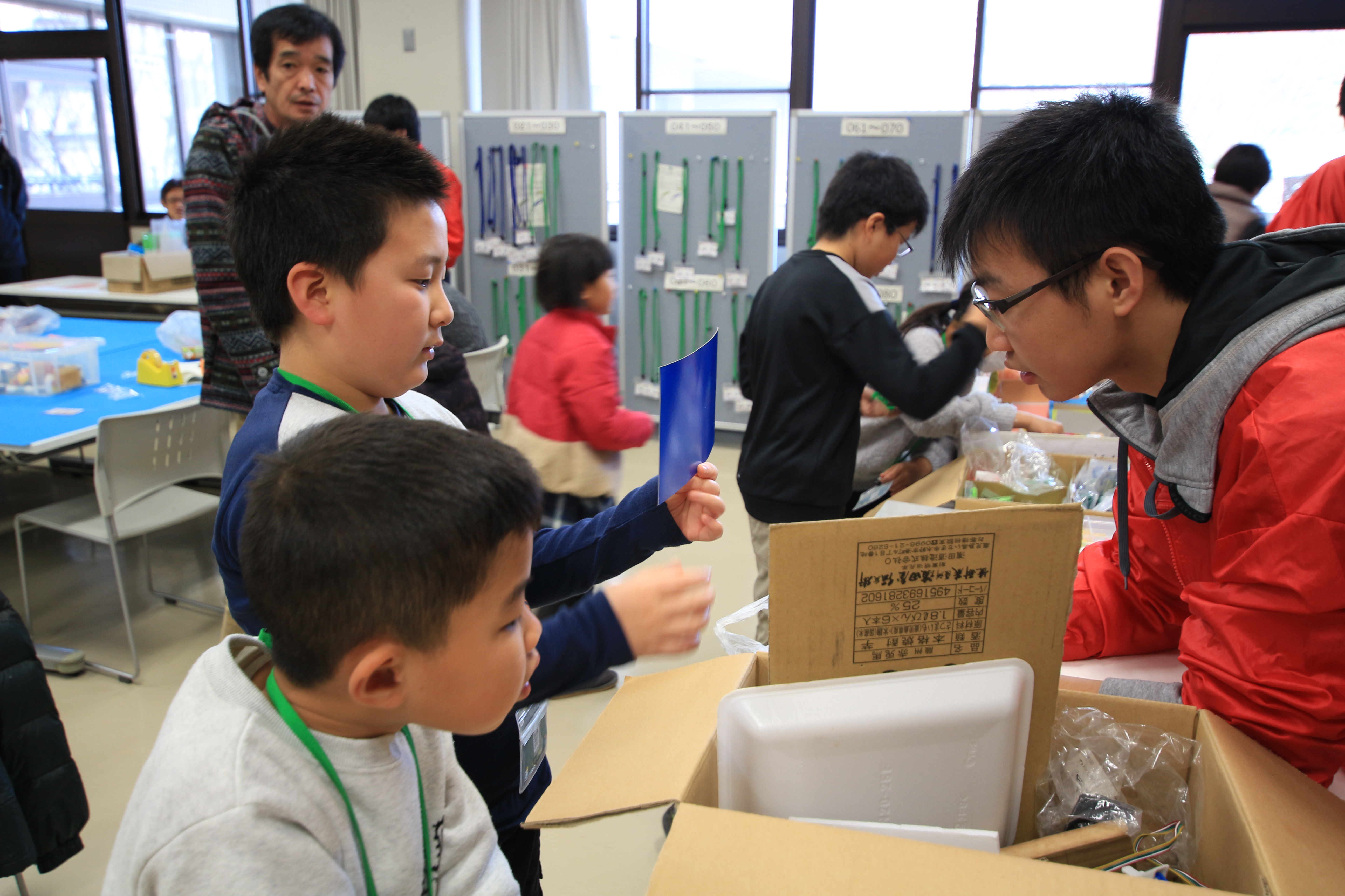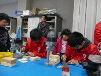 前回製作した作品をモーター駆動にする作業を行いました。見本を参考にしたり、指導員や学生からアドバイスを受けて一生懸命製作しました。