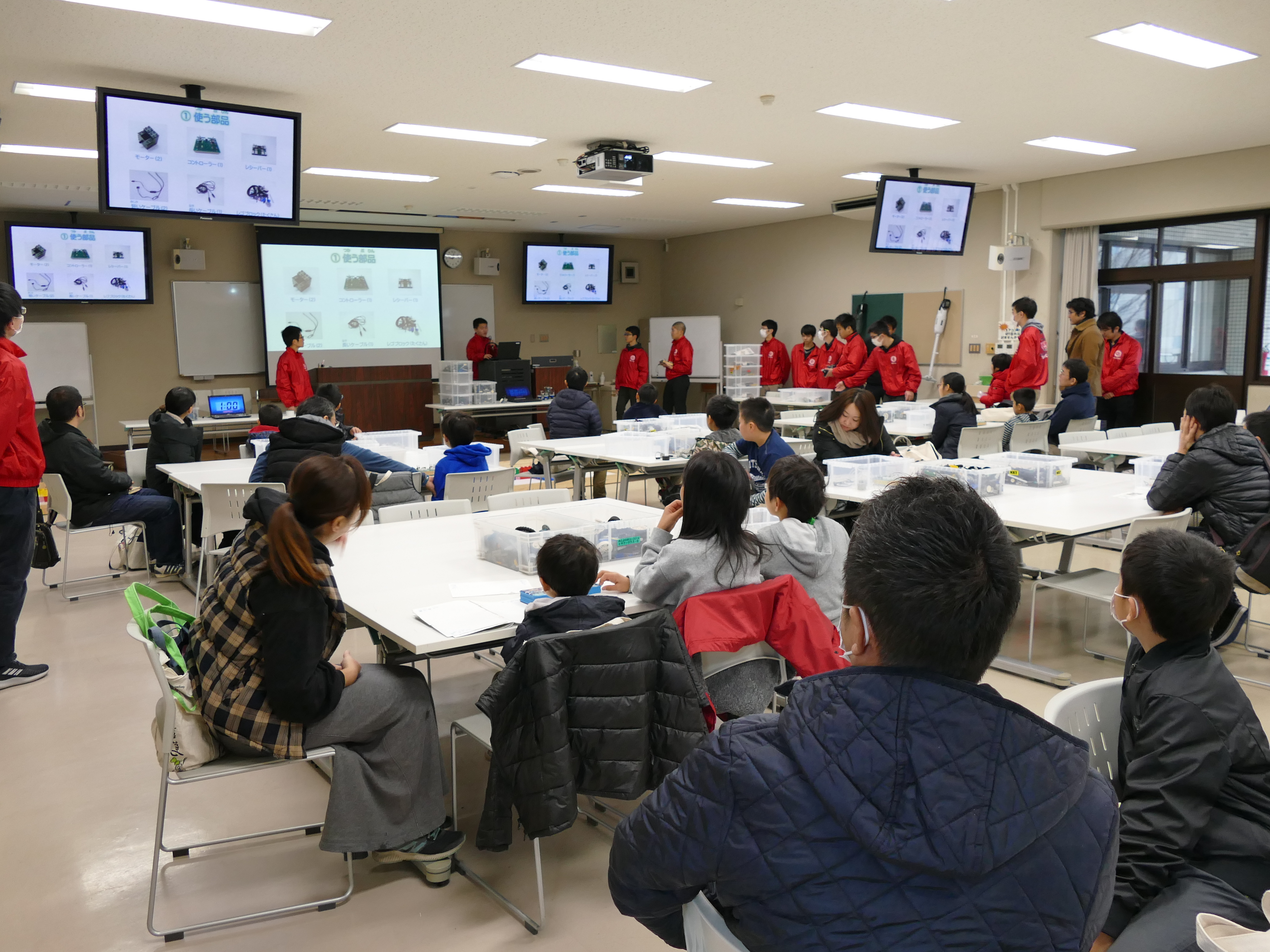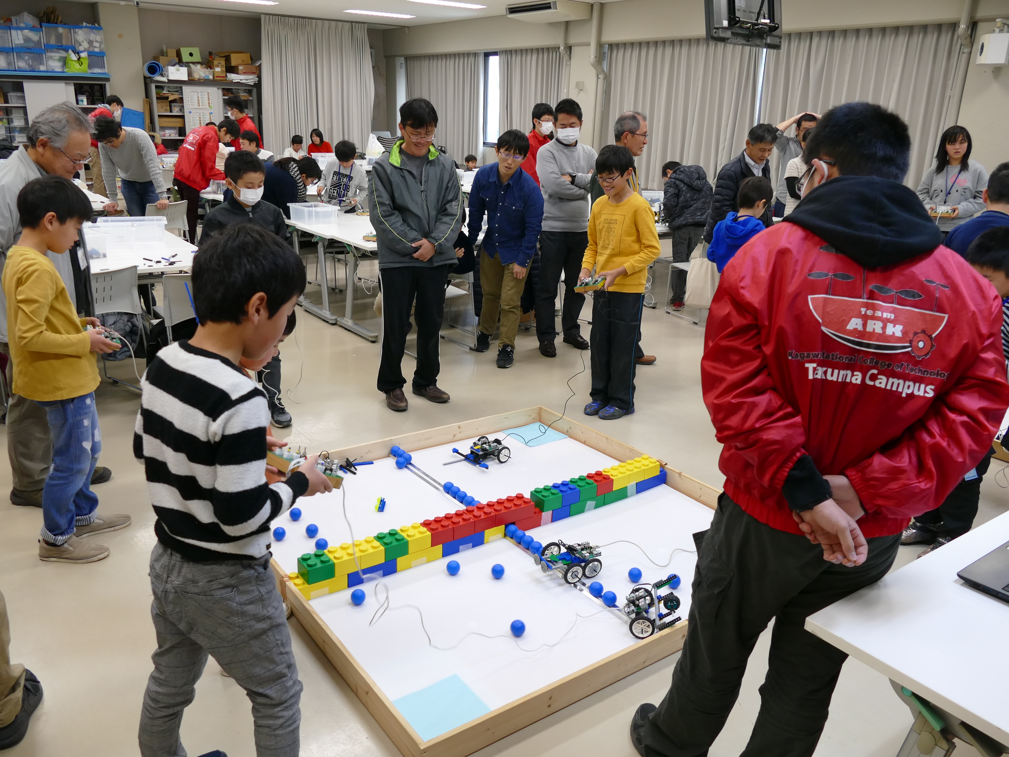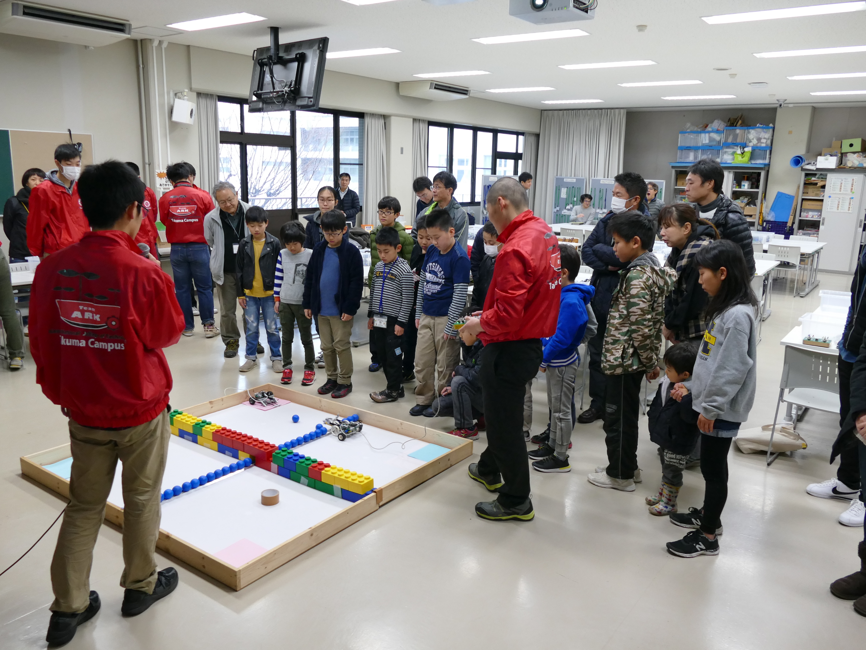 1月12日(土)午前9時~11時、詫間キャンパスにおいて三豊市少年少女発明クラブ「ロボコン基礎(1) 」が開催され、詫間キャンパスロボコンチーム「TEAM ARK」の学生がレゴ部品とオリジナルコントローラを使ったロボット教室を行いました。