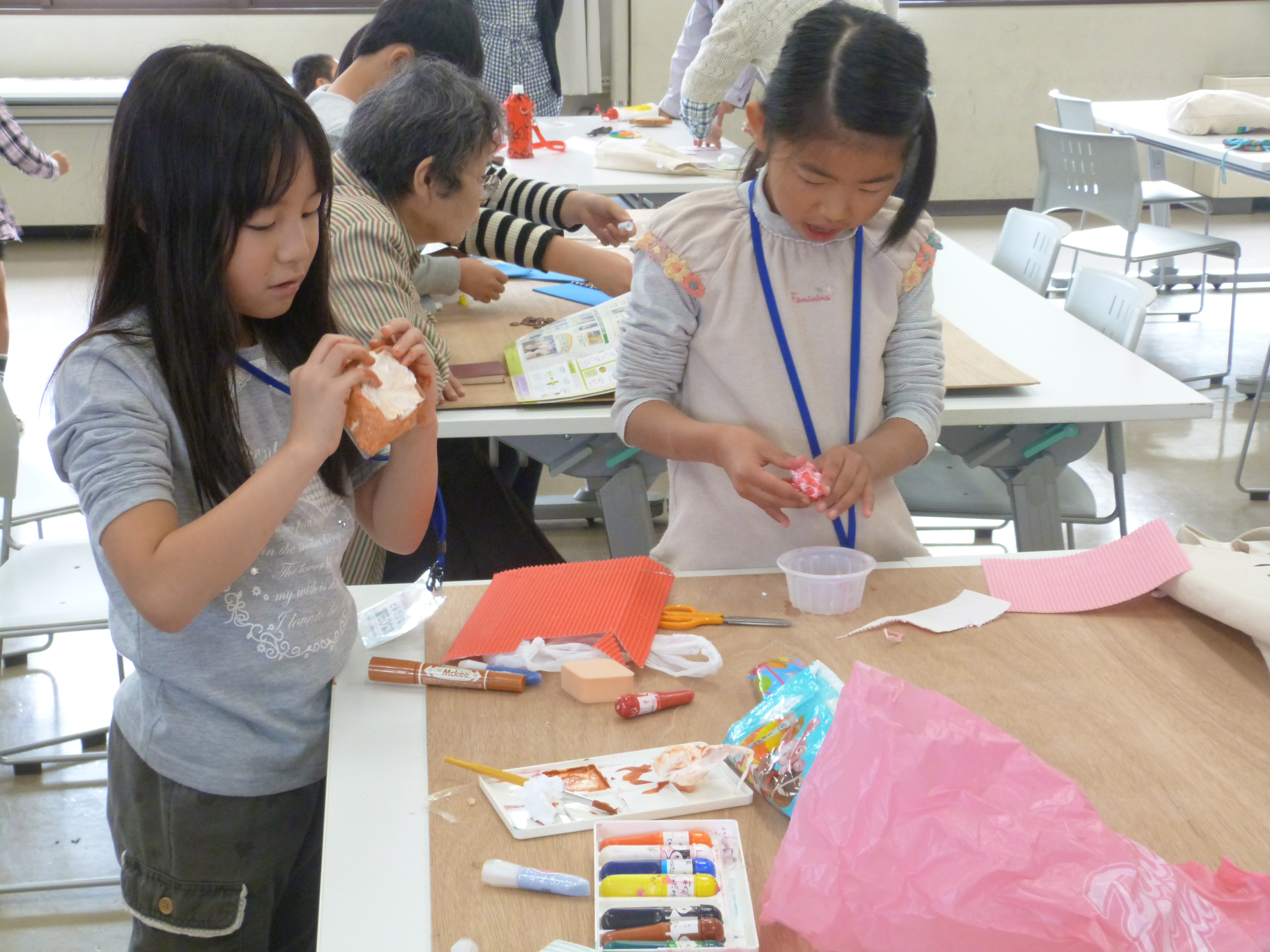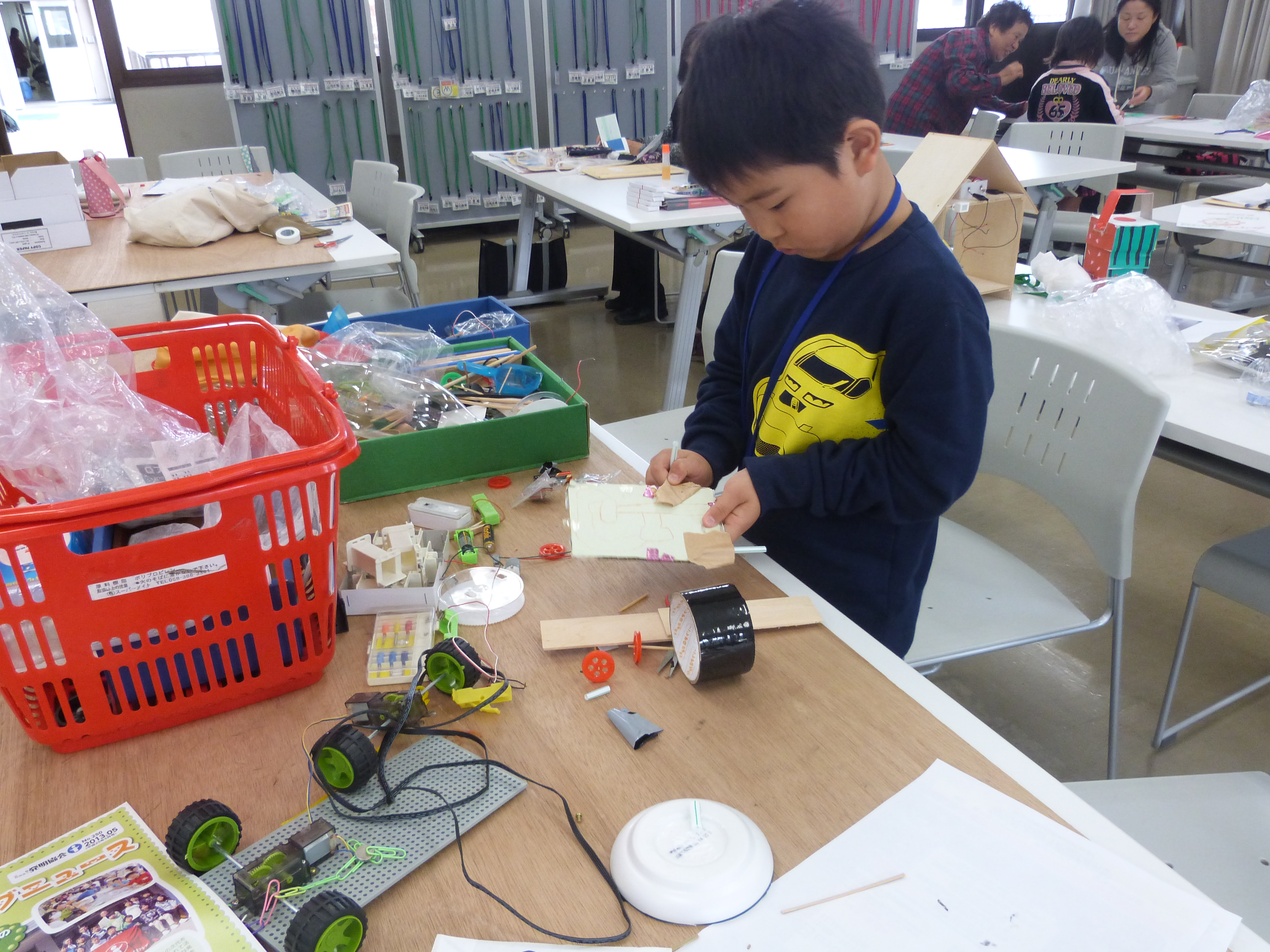 発明クラブでは、活動の中で子ども達の自由な発想を活かした作品作りをサポートし、ものづくりへの意欲を高めています。この日は家庭から持ち寄った廃材等を利用した自由工作を行いました。紙粘土や絵の具を使用した工作や、モーターやプロペラ、豆電球を使用した動いたり光ったりする工作など、思いついたものをどんどん作っていきました。初めはなかなか考えがまとまらなかった子も、いろいろな材料を手に取る内にイメージが湧いてきた様子で、時間いっぱい集中して手を動かしていました。