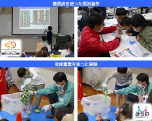 今回は、四国電力株式会社より講師をお招きして「備長炭を使った電池製作」と「液体窒素の実験」を行いました。