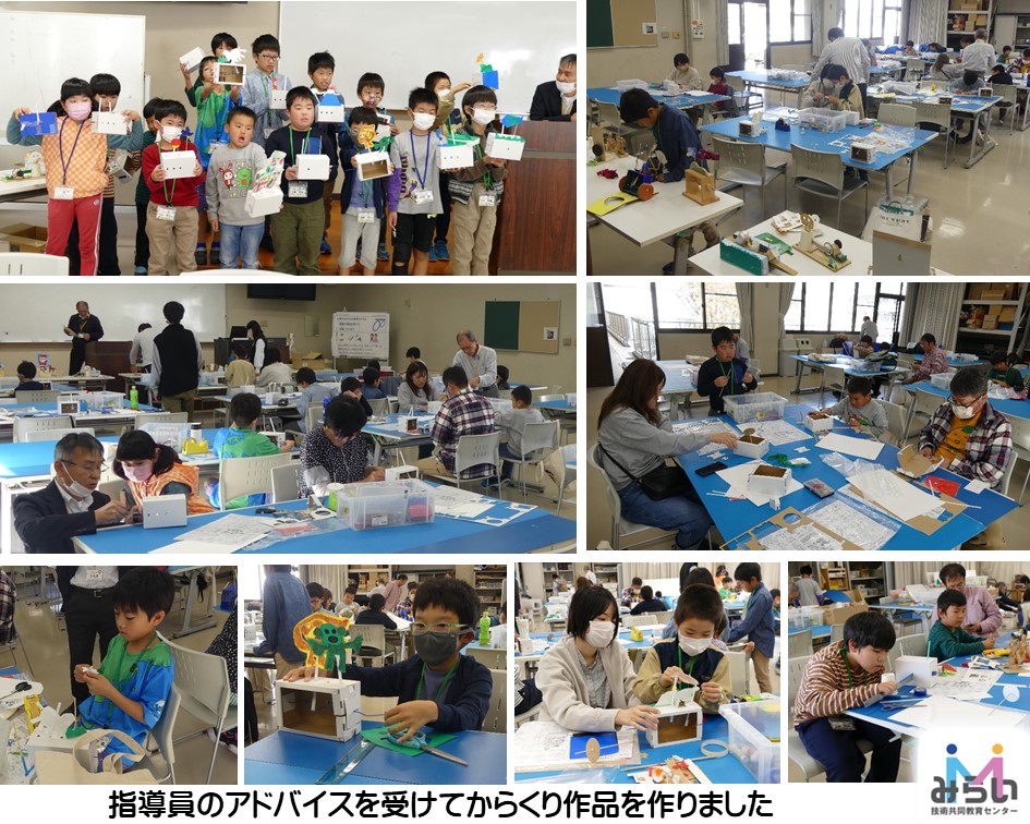最初に指導員の作った作品でからくりの説明を聞き、クランクやカムを利用して、動物や人形がスムーズに動くよう、指導員からアドバイスを受けながらからくり工作を行いました。