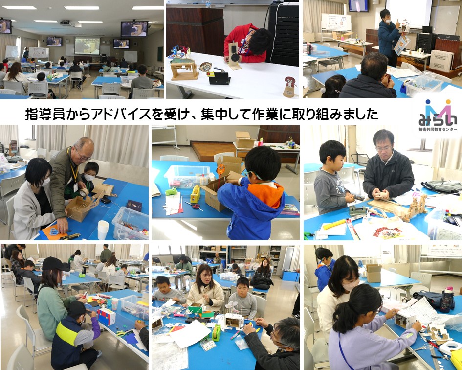 サンプル作品を参考にしたり、指導員に教えてもらいながらオリジナル作品作りに集中して取り組みました。