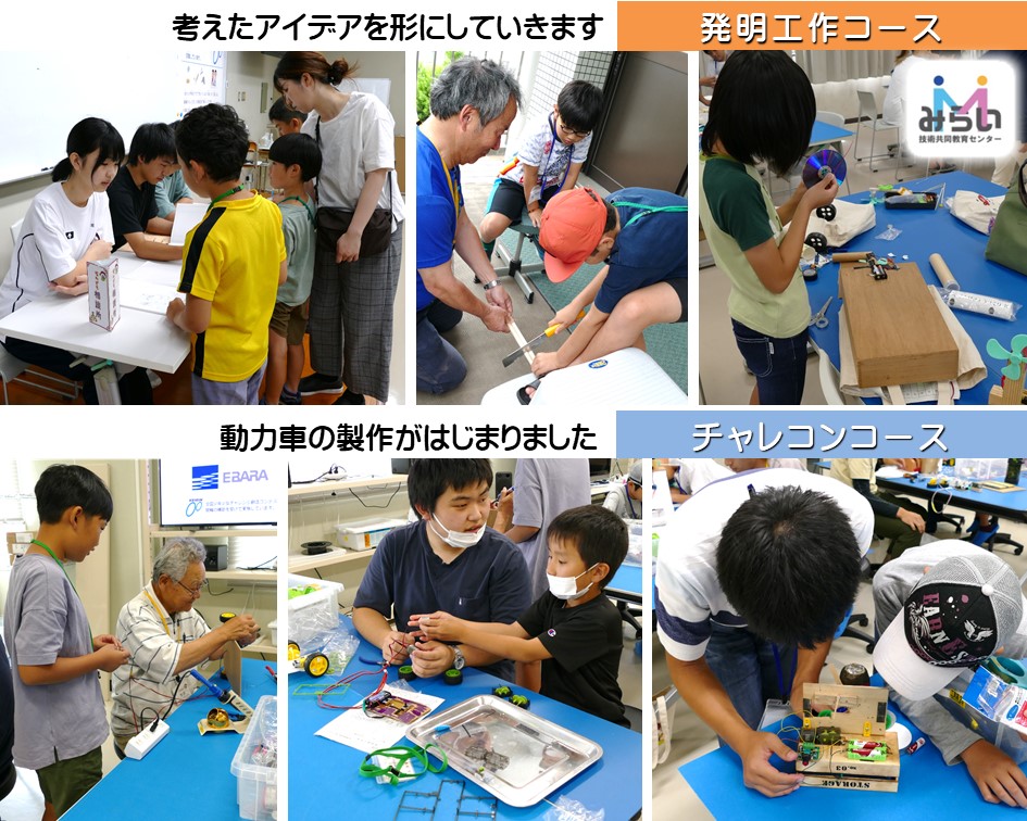 発明工作コースでは、前回アイデアを考えて書き込んだノートを見ながら「どのようにすれば実現できるか」を考え、指導員やサポート学生に相談しながら作品づくりを開始しました。まず考えて作る!問題があれば考えて解決する!その繰り返しが始まりました。