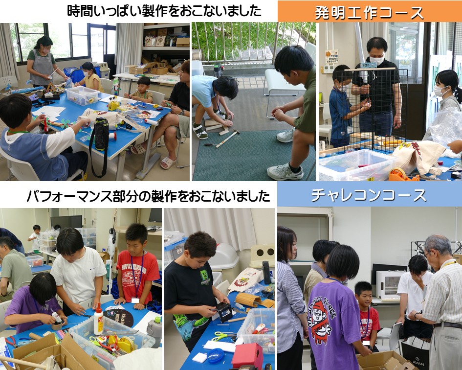 チャレコンコースでは、台車の製作は終わり、動力車とパフォーマンスカーの上部の製作を進めました。自分たちが考えたパフォーマンスをどのように表現するかを相談しながら、そのアイディアを実現するため作業をおこないました。